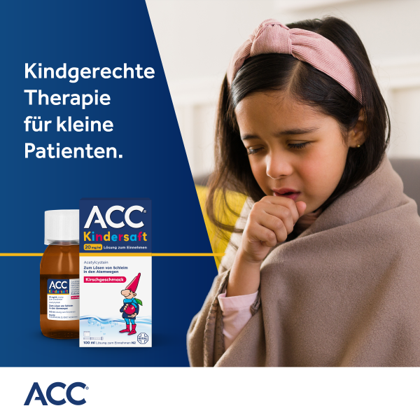 Kinder sind besonders häufig von einer Erkältung betroffen: Bis zu zehn Erkrankungen pro Jahr gelten als normal. Husten ist dabei ein häufiges und störendes Symptom: Im Verlauf der Erkältung bildet sich zäher Schleim in den Atemwegen, der nur schwer abgehustet werden kann. Gut, dass es ACC® Kindersaft gibt! Neben liebevoller Pflege und Zuwendung erleichtert ACC® Kindersaft das Abhusten von zähflüssigem Schleim. Ohne Alkohol, Zucker oder Farbstoffe ist er genau auf die Bedürfnisse von kleinen Hustenpatienten ab 2 Jahren zugeschnitten. Dank der praktischen Dosierhilfe nimmt Ihr Kind immer die richtige Menge Hustensaft ein. Und der leckere Kirschgeschmack kommt gerade bei Kindern gut an. Denn ACC® Kindersaft löst den Schleim, erleichtert das Abhusten und befreit so die Bronchien.