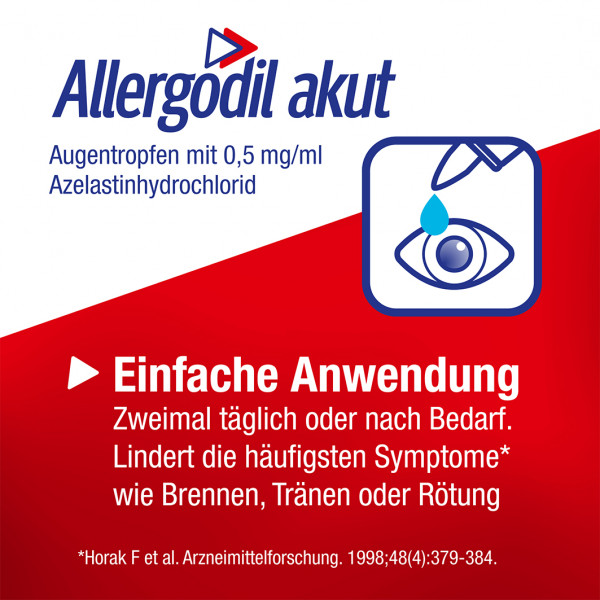 - SYMPTOMLINDERUNG: Brennende, rote, juckende sowie tränende Augen infolge einer Allergie können durch Allergodil akut Augentropfen gelindert werden. Dafür 2x täglich jeweils einen Tropfen in jedes Auge