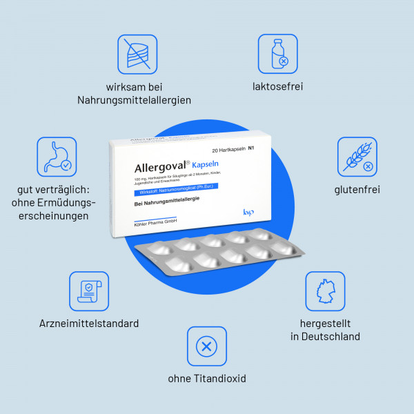 Erwachsene und Jugendliche ab dem 15. Lebensjahr nehmen viermal täglich 2 Kapseln Allergoval (entsprechend insgesamt 800 mg Natriumcromoglicat) ein. Kinder im Alter von zwei bis vierzehn Jahren erhalten viermal täglich eine Kapsel Allergoval (entsprechend insgesamt 400 mg Natriumcromoglicat). Bei Säuglingen und Kleinkindern zwischen zwei Monaten und zwei Jahren beträgt die Tagesdosis 20 - 40 mg/kg Körpergewicht. Sie sollte möglichst in gleich großen Einzeldosen vor jeder Mahlzeit verabreicht werden. Hierzu ist es gegebenenfalls erforderlich, den Inhalt einer Kapsel auf mehrere Gaben zu verteilen. Sofern erforderlich, kann die Dosis bei Erwachsenen auf viermal täglich 5 Kapseln Allergoval, bei Kindern im Alter von zwei bis vierzehn Jahren auf maximal viermal täglich 2 Kapseln Allergoval (entsprechend insgesamt 800 mg Natriumcromoglicat) erhöht werden. Eine Tagesdosis von 40 mg/kg Körpergewicht sollte jedoch nicht überschritten werden.