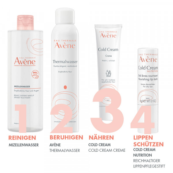 Die Avène Cold Cream Creme schützt die Haut durch den hohen Anteil an weißem Bienenwachs vor dem Austrocknen und macht die Haut wieder weich und geschmeidig. Die leicht duftende Textur wirkt rückfettend und bildet einen Kälteschutz bis -1° C.