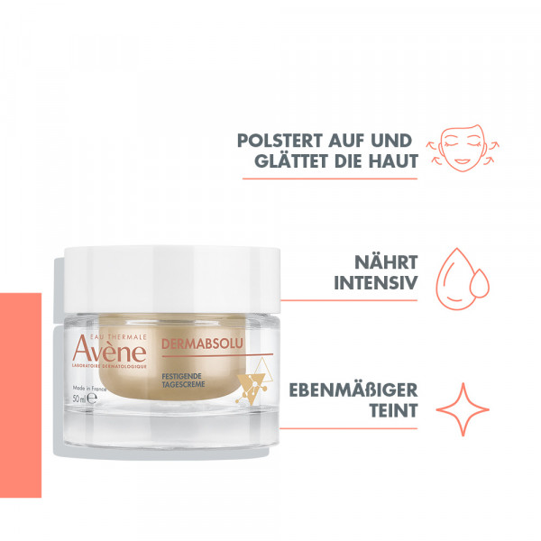 Die Avène DERMABSOLU festigende Tagescreme unterstützt die Haut beim Kampf gegen die sichtbaren Zeichen der Hautalterung und definiert die Gesichtskonturen neu, dank des dermatologischen Aktivstofftrios: