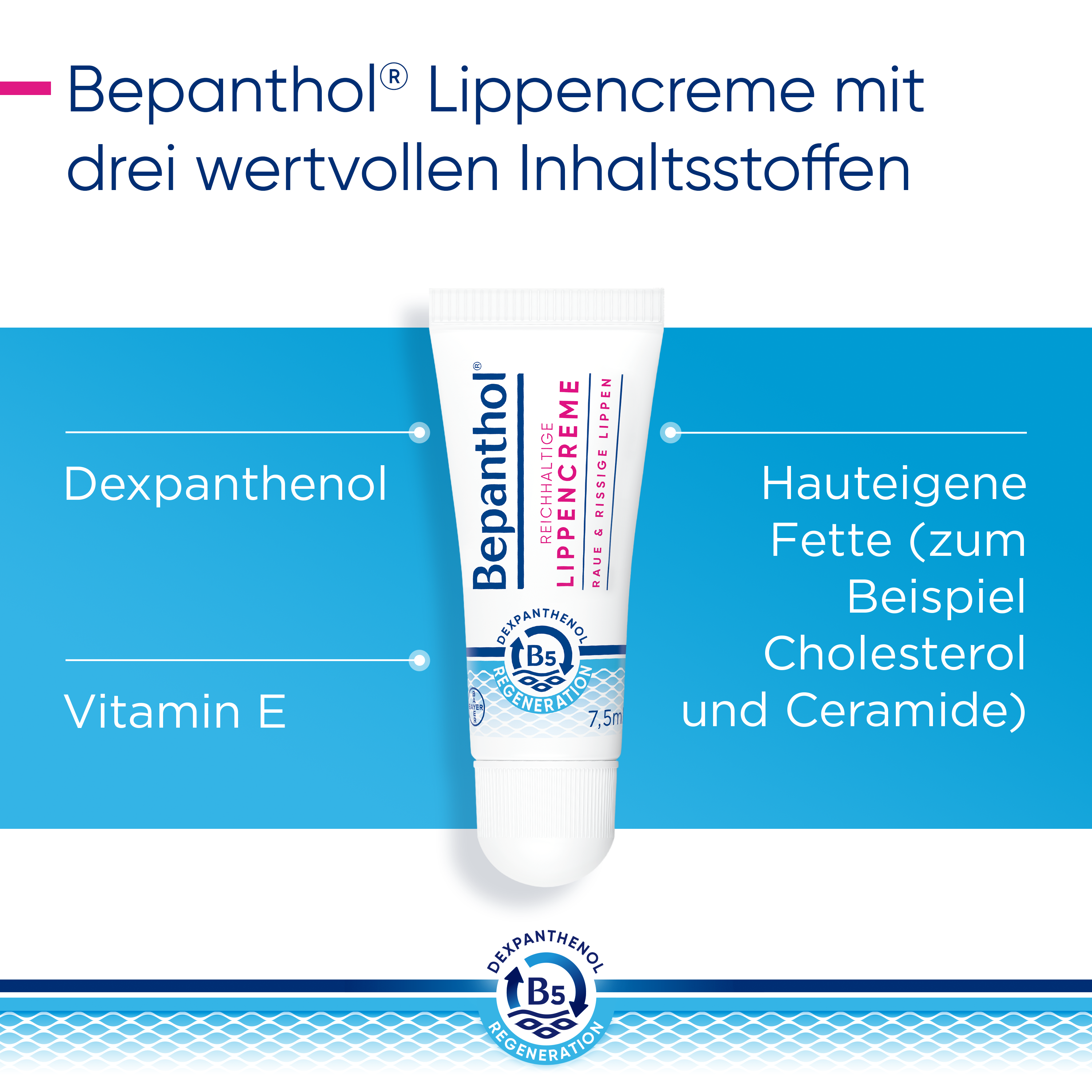 Bestellen können Sie die Bepanthol® Reichhaltige Lippencreme in der 7,5 Milliliter-Tube – im optimalen Format und somit perfekt für unterwegs geeignet.