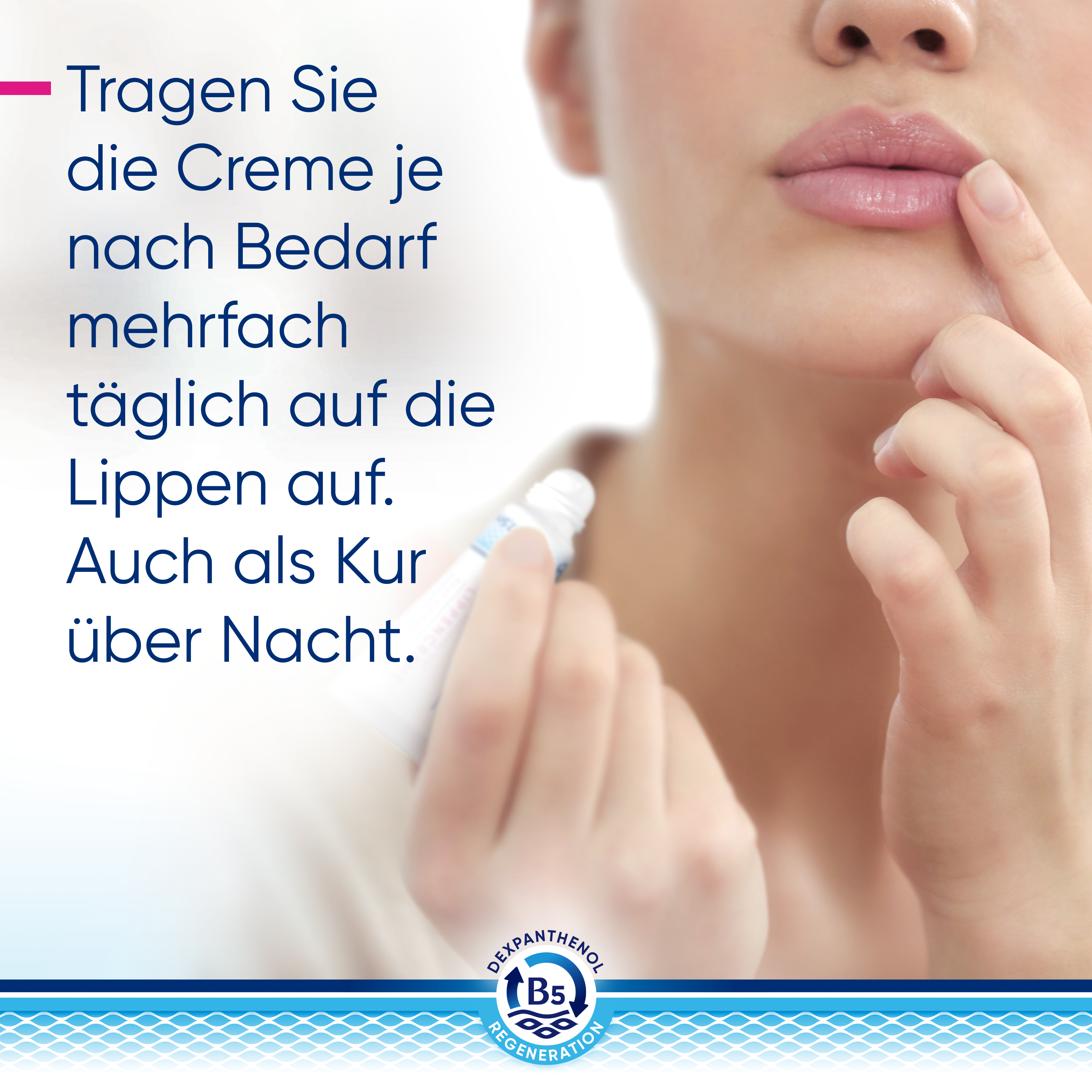 Die Anwendung der Bepanthol® Reichhaltigen Lippencreme: Bei Bedarf – also, wenn sich die Lippen trocken und/oder rissig anfühlen – tragen Sie die Creme auf die strapazierten Lippen auf. Für besonders reichhaltige Pflege können Sie die Bepanthol® Reichhaltige Lippencreme auch als Kur über Nacht einsetzen. Dazu cremen Sie sie vor dem Schlafengehen besonders sorgfältig ein.
