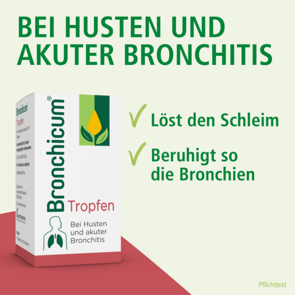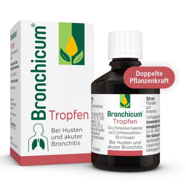 Bronchicum® Tropfen werden angewendet zur Behandlung der Symptome einer akuten Bronchitis und Erkältungskrankheiten der Atemwege mit zähflüssigem Schleim.