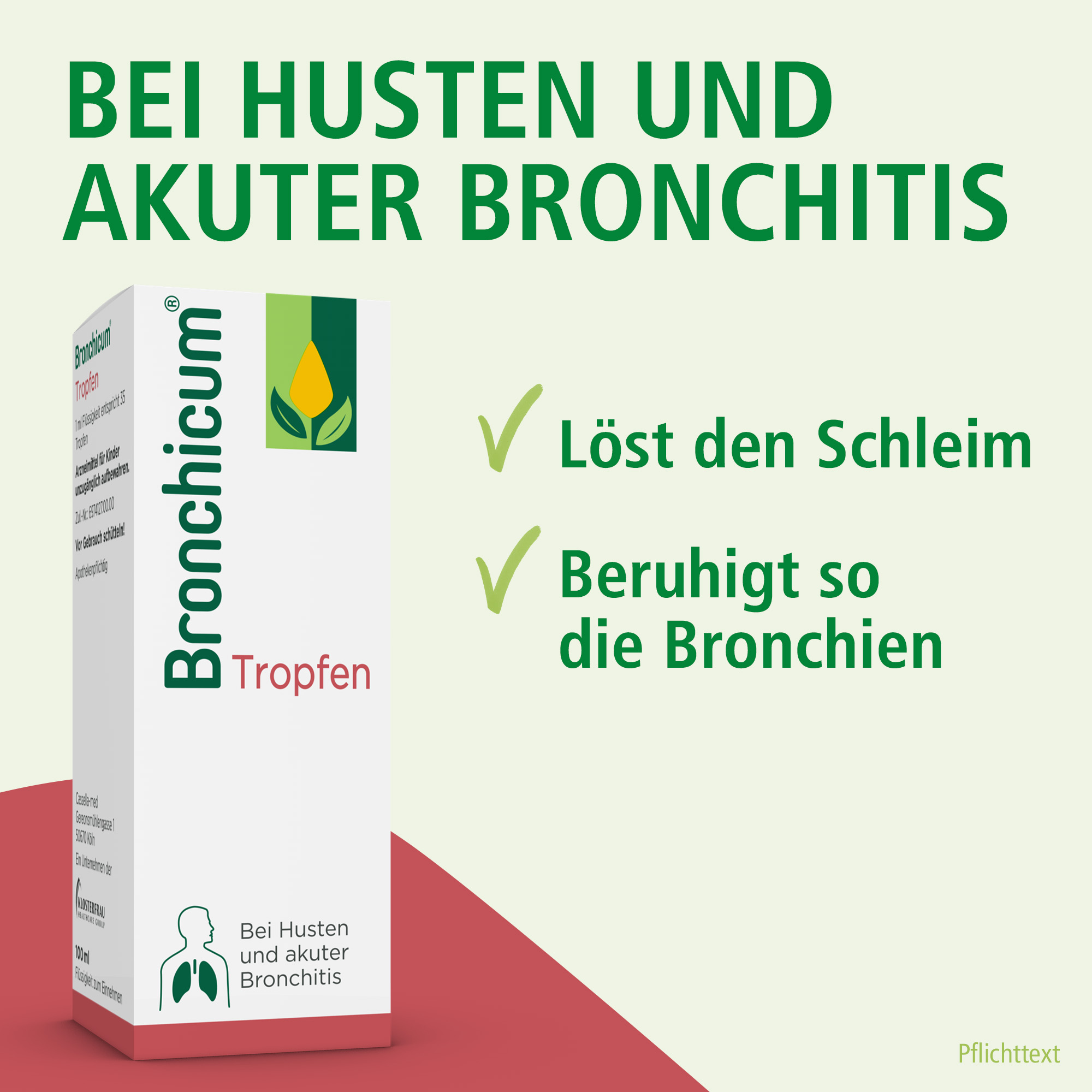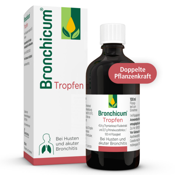Bronchicum® Tropfen werden angewendet zur Behandlung der Symptome einer akuten Bronchitis und Erkältungskrankheiten der Atemwege mit zähflüssigem Schleim.