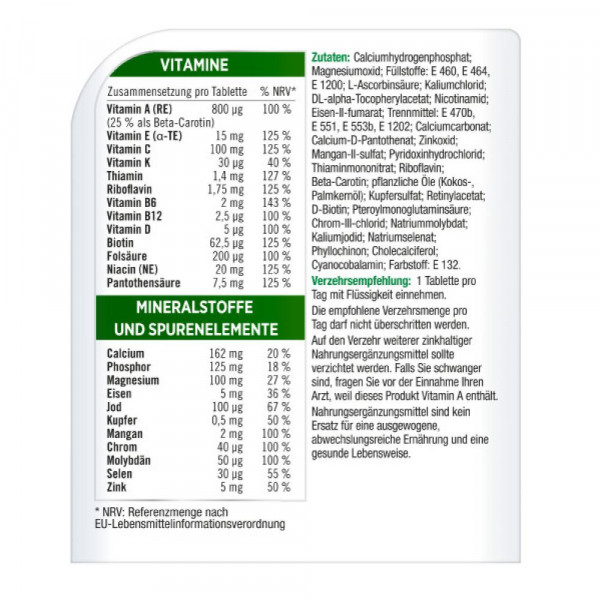 Zusammensetzung: Mikronährstoffe pro Tablette % NRV[*] Vitamin A (RE) (25% als Beta-Carotin) 800 µg 100 % Vitamin E (α-TE) 15 mg 125 % Vitamin C 100 mg 125 % Vitamin K 30 µg 40 % Thiamin 1,4 mg 127 % Riboflavin 1,75 mg 125 % Vitamin B6 2 mg 143 % Vitamin B12 2,5 µg 100 % Vitamin D 5 µg 100 % Biotin 62,5 µg 125 % Folsäure 200 µg 100 % Niacin (NE) 20 mg 125 % Pantothensäure 7,5 mg 125 % Calcium 162 mg 20 % Phosphor 125 mg 18 % Magnesium 100 mg 27 % Eisen 5 mg 36 % Jod 100 µg 67 % Kupfer 500 µg 50 % Mangan 2 mg 100 % Chrom 40 µg 100 % Molybdän 50 µg 100 % Selen 30 µg 55 % Zink 5 mg 50 % * NRV: Referenzmenge nach EU-Lebensmittelinformationsverordnung.