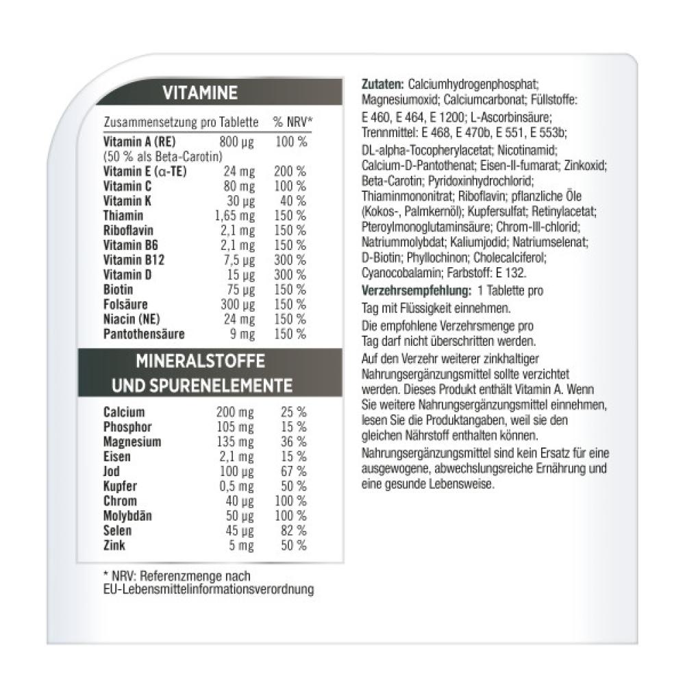 Calciumhydrogenphosphat; Magnesiumoxid; Calciumcarbonat; Füllstoffe: E 460, E 464, E 1200; L-Ascorbinsäure; Trennmittel: E 468, E 470b, E 551, E 553b; DL-alpha-Tocopherylacetat; Nicotinamid; Calcium-D-Pantothenat; Eisen-II-fumarat; Zinkoxid; Beta-Carotin; Pyridoxinhydrochlorid; Thiaminmononitrat; Riboflavin; pflanzliche Öle (Kokos-, Palmkernöl); Kupfersulfat; Retinylacetat; Pteroylmonoglutaminsäure; Chrom-III-chlorid; Natriummolybdat; Kaliumjodid; Natriumselenat; D-Biotin; Phyllochinon; Cholecalciferol; Cyanocobalamin; Farbstoff: E 132.