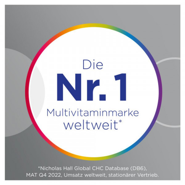 Zusammensetzung: Mikronährstoffe pro Tablette % NRV[*] Vitamin A (RE) (50% als Beta-Carotin) 800 µg 100 % Vitamin E (α-TE) 18 mg 150 % Vitamin C 120 mg 150 % Vitamin K 30 µg 40 % Thiamin 1,65 mg 150 % Riboflavin 2,1 mg 150 % Vitamin B6 2,1 mg 150 % Vitamin B12 3 µg 120 % Vitamin D 5 µg 100 % Biotin 75 µg 150 % Folsäure 300 µg 150 % Niacin (NE) 24 mg 150 % Pantothensäure 9 mg 150 % Calcium 162 mg 20 % Phosphor 125 mg 18 % Magnesium 100 mg 27 % Eisen 2,1 mg 15 % Jod 100 µg 67 % Kupfer 500 µg 50 % Mangan 2 mg 100 % Chrom 40 µg 100 % Molybdän 50 µg 100 % Selen 30 µg 55 % Zink 5 mg 50 % * NRV: Referenzmenge nach EU-Lebensmittelinformationsverordnung.