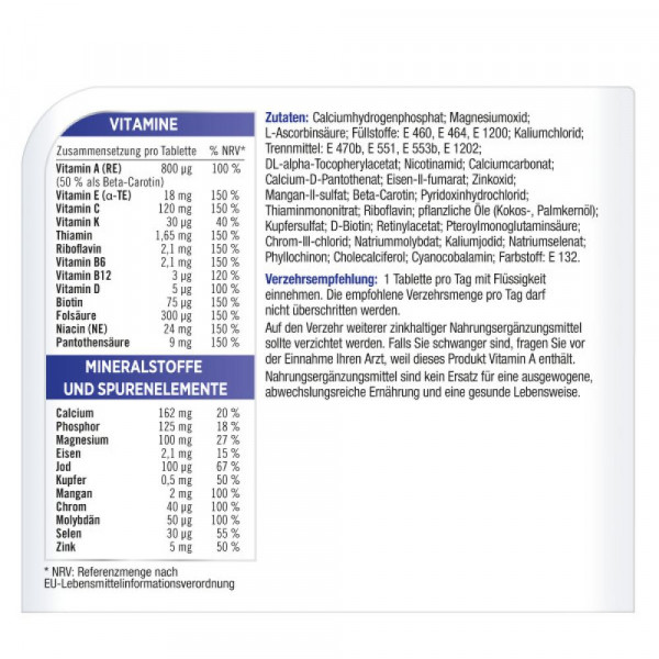 Zusammensetzung: Mikronährstoffe pro Tablette % NRV[*] Vitamin A (RE) (50% als Beta-Carotin) 800 µg 100 % Vitamin E (α-TE) 18 mg 150 % Vitamin C 120 mg 150 % Vitamin K 30 µg 40 % Thiamin 1,65 mg 150 % Riboflavin 2,1 mg 150 % Vitamin B6 2,1 mg 150 % Vitamin B12 3 µg 120 % Vitamin D 5 µg 100 % Biotin 75 µg 150 % Folsäure 300 µg 150 % Niacin (NE) 24 mg 150 % Pantothensäure 9 mg 150 % Calcium 162 mg 20 % Phosphor 125 mg 18 % Magnesium 100 mg 27 % Eisen 2,1 mg 15 % Jod 100 µg 67 % Kupfer 500 µg 50 % Mangan 2 mg 100 % Chrom 40 µg 100 % Molybdän 50 µg 100 % Selen 30 µg 55 % Zink 5 mg 50 % * NRV: Referenzmenge nach EU-Lebensmittelinformationsverordnung.
