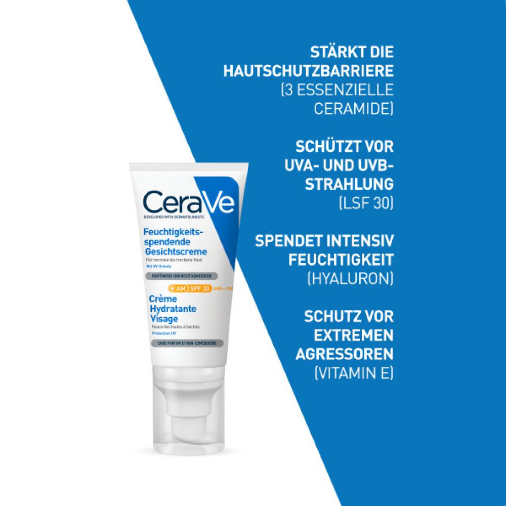 Die CeraVe Feuchtigkeitsspendende Gesichtscreme mit LSF 30 spendet normaler bis trockener Haut bis zu 24 Stunden Feuchtigkeit