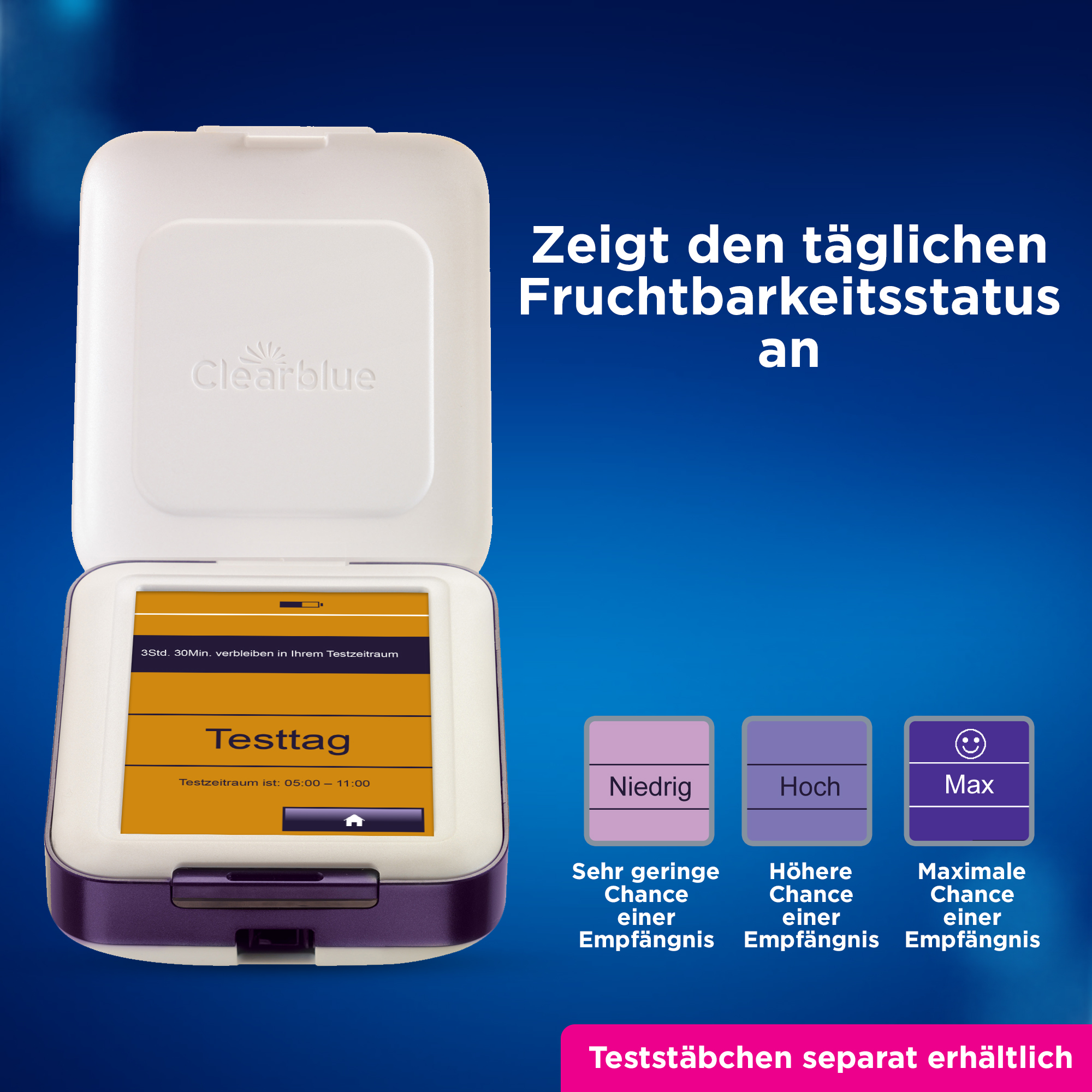 Teststäbchen sind in dieser Packung NICHT enthalten. Diese Packung enthält 1 Clearblue Fertilitätsmonitor Advanced, der nur mit Clearblue Fertilitätsmonitor Advanced Fruchtbarkeitsteststäbchen und Clearblue Fertilitätsmonitor Advanced Schwangerschaftsteststäbchen verwendet werden kann – alle separat in der Clearblue Fertilitätsmonitor Advanced Teststäbchen-Nachfüllpackung erhältlich: 30 Fruchtbarkeitstests für den Eisprung & 3 Schwangerschaftstests.