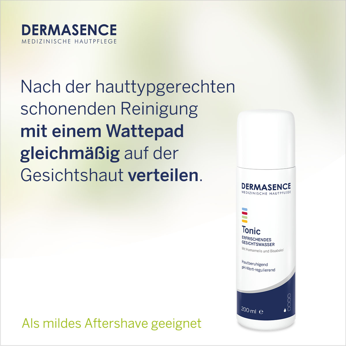 Das feuchtigkeitsspendende Gesichtswasser erfrischt und beruhigt die Haut nach der Reinigung. Es reguliert den pH-Wert und ist mit geringem Alkoholanteil besonders gut verträglich. Auch als mildes Aftershave geeignet.Charakteristik:- Wirkt erfrischend und sanft hautklärend nach jeder Gesichtsreinigung- Unterstützt die Wiederherstellung des natürlichen Haut-pH-Wertes- Hamamelis und Bisabolol sowie Panthenol und Allantoin pflegen und beruhigen die Haut- Enthält feuchtigkeitsspendende Wirkstoffe- Mit geringem Alkoholanteil (5%), besonders hautverträglich- Als mildes Aftershave geeignet- Frei von dermatologisch bedenklichen Duftstoffen- Frei von Phenoxyethanol- Dermatologisch getestet- Ausflockung möglich und unbedenklichAnwendung:Nach der hauttypabhängigen schonenden Reinigung mit einem Wattebausch gleichmäßig auf der Gesichtshaut verteilen. Für die Reinigung empfehlen wir: DERMASENCE Reinigungsmilch für die empfindliche, trockene Haut, DERMASENCE Mousse für die fettende Haut.Pflegetipp:Zur anschließenden Gesichtspflege empfehlen wir je nach Hauttyp: DERMASENCE Cream Rich für die normale Haut, DERMASENCE Cream + Mask für die trockene Haut und DERMASENCE Cream Soft für die fettige Haut.
