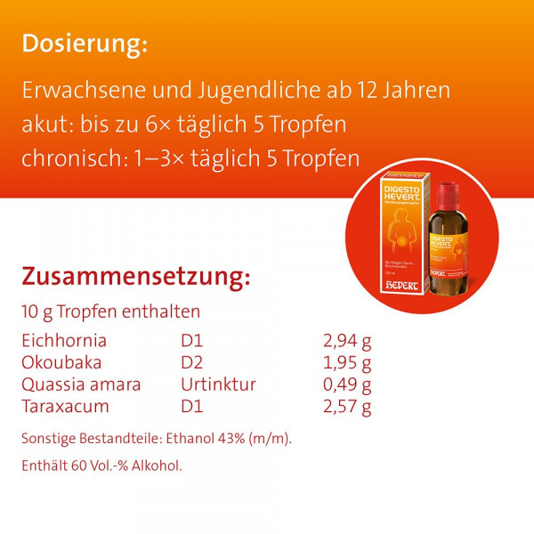 Digesto Hevert Verdauungstropfen Die Anwendungsgebiete leiten sich von den homöopathischen Arzneimittelbildern ab. Dazu gehört: Verdauungsschwäche. – Bei anhaltenden, unklaren oder neu auftretenden Beschwerden sollte ein Arzt aufgesucht werden, da es sich um Erkrankungen handeln kann, die einer ärztlichen Abklärung bedürfen. Enthält 60 Vol.-% Alkohol. Zu Risiken und Nebenwirkungen lesen Sie die Packungsbeilage und fragen Sie Ihren Arzt oder Apotheker.