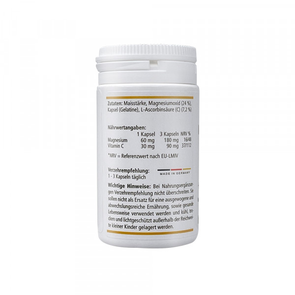 Zusammensetzung/Kapsel: Maisstärke, Magnesiumoxid (24 %), Kapsel (Gelatine), L-Ascorbinsäure (C) (7,2 %)