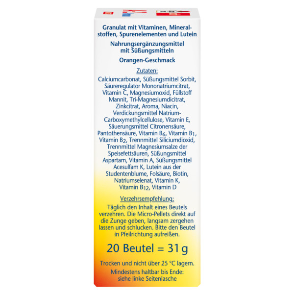 Calciumcarbonat, Süßungsmittel Sorbit, Säureregulator Mononatriumcitrat, Magnesiumoxid, L-Ascorbinsäure, Füllstoff Mannit, Tri-Magnesiumdicitrat, Natrium-L-ascorbat, Zinkcitrat, Aroma, Nicotinamid, Verdickungsmittel Natrium-Carboxymethylcellulose, DL-alpha-Tocopherylacetat, Säuerungsmittel Citronensäure, Calcium-D-pantothenat, Pyridoxinhydrochlorid, Thiaminmononitrat, Riboflavin, Trennmittel Siliciumdioxid, Trennmittel Magnesiumsalze der Speisefettsäuren, Süßungsmittel Aspartam, Retinylpalmitat, Süßungsmittel Acesulfam K, Lutein aus der Studentenblume, Pteroylmonoglutaminsäure, D-Biotin, Natriumselenat, Phytomenadion, Cyanocobalamin, Cholecalciferol