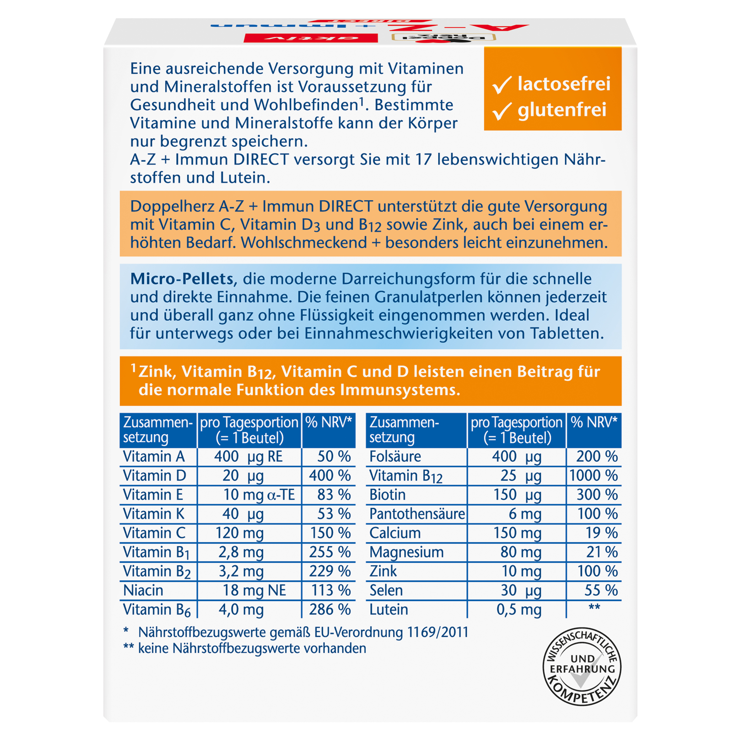 Eine ausreichende Versorgung mit Vitaminen und Mineralstoffen ist Voraussetzung für Gesundheit und Wohlbefinden. Bestimmte Vitamine und Mineralstoffe kann der Körper nur begrenzt speichern. Doppelherz A–Z DIRECT + Immun versorgt Sie mit 17 lebenswichtigen Nährstoffen und Lutein. Doppelherz A–Z DIRECT + Immun unterstützt die gute Versorgung mit Vitamin C, Vitamin D3 und B12 sowie Zink, auch bei einem erhöhten Bedarf. Zink, Vitamin B12, Vitamin C und D leisten einen Beitrag für die normale Funktion des Immunsystems. Bei unseren Micro-Pellets handelt es sich um eine moderne Darreichungsform für die schnelle und direkte Einnahme. Die feinen Granulatperlen können jederzeit und überall ganz ohne Flüssigkeit eingenommen werden. Ideal für unterwegs oder bei Einnahmeschwierigkeiten von Tabletten und dabei wohlschmeckend.