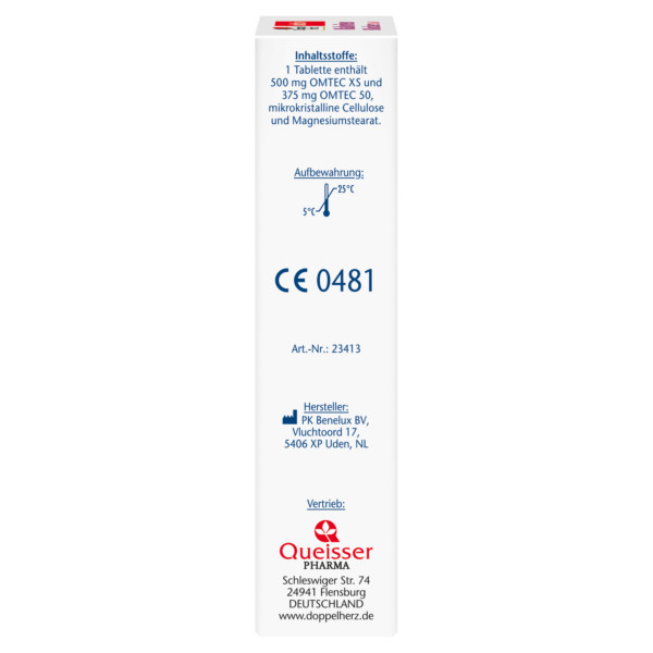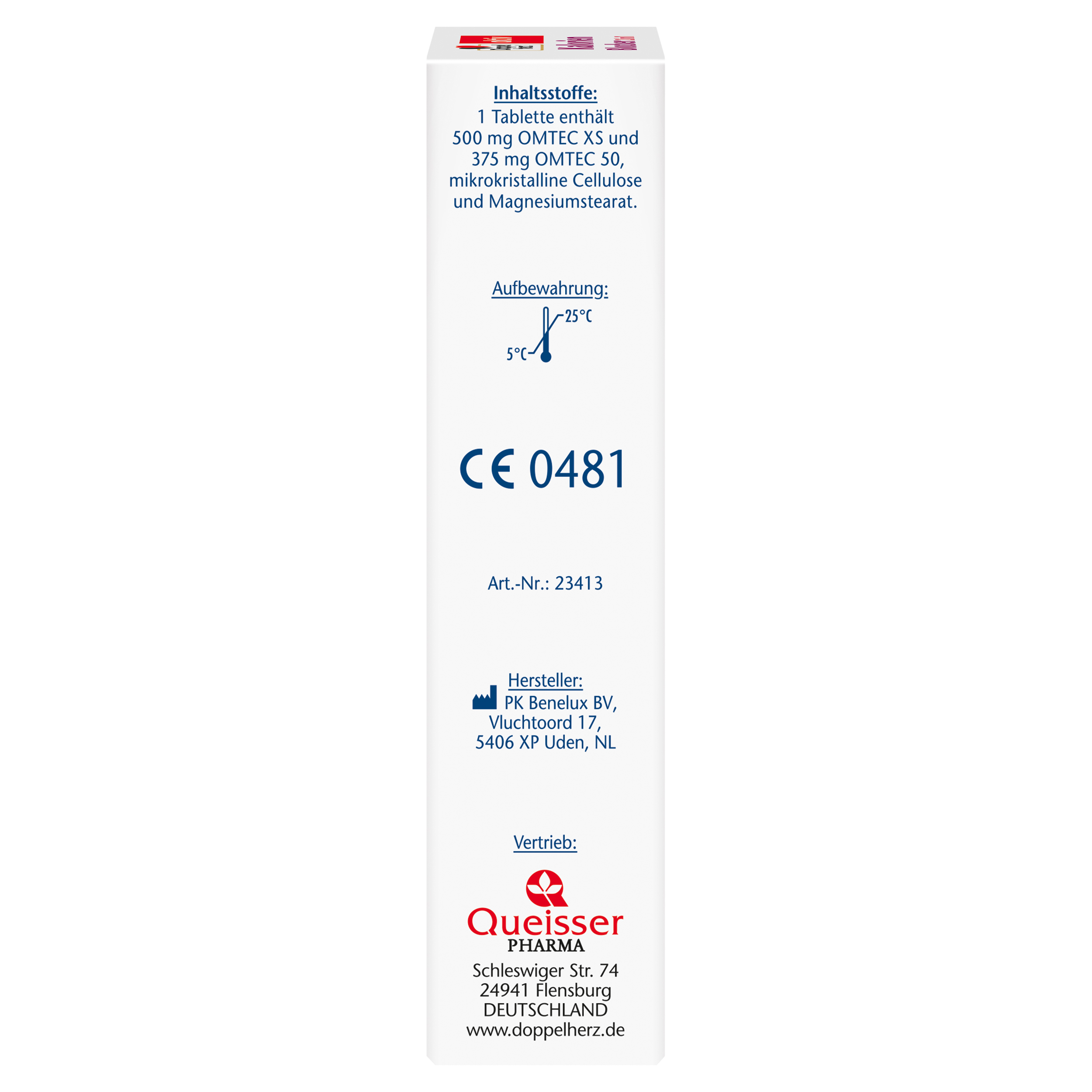 1 Tablette Doppelherz Kalorien Blocker 2 in 1 enthält 500 mg Omtec XS® und 375 mg Omtec 50. Sonstige Bestandteile sind mikrokristalline Cellulose, Hydroxypropylcellulose und Magnesiumstearat.