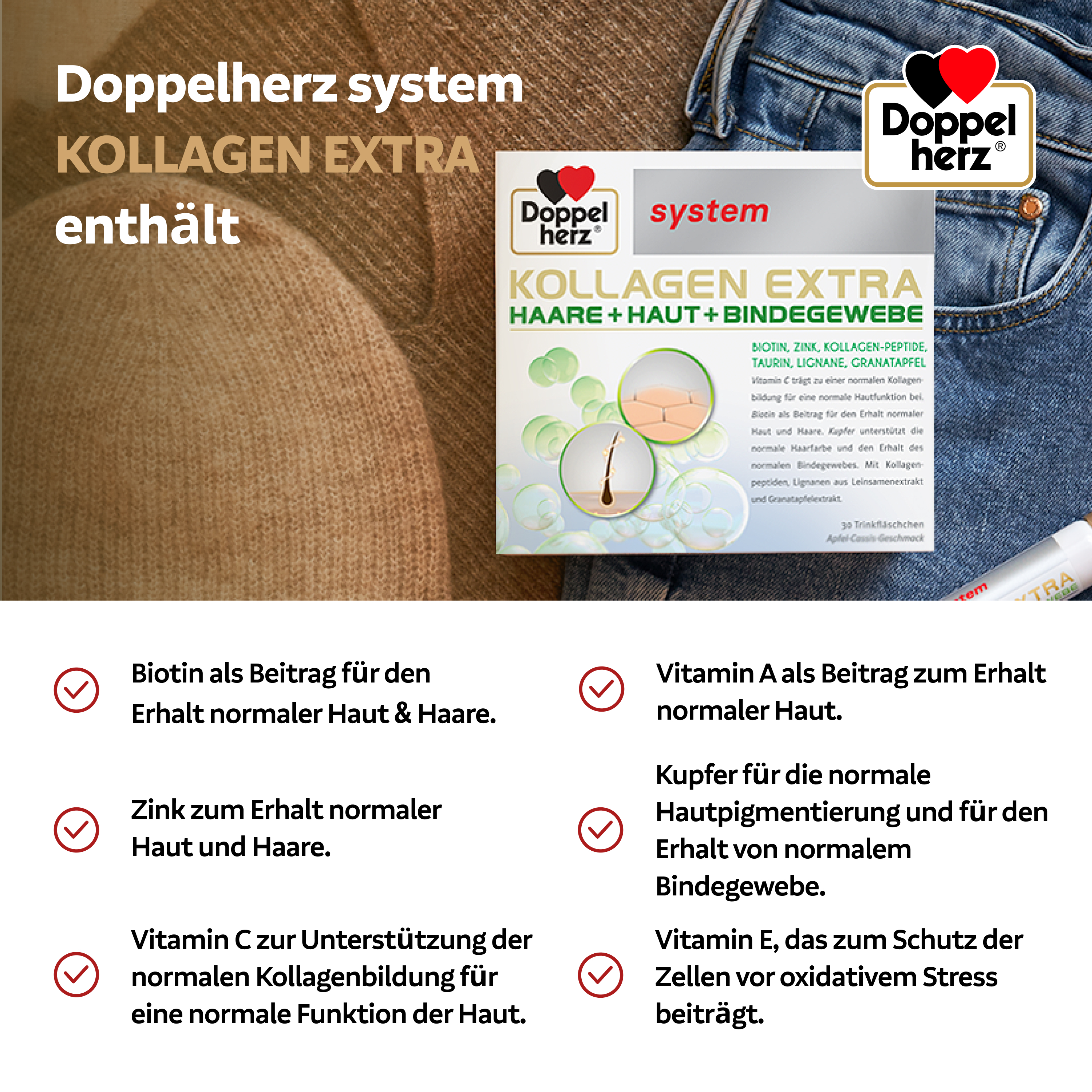 • Biotin als Beitrag für den Erhalt normaler Haut & Haare