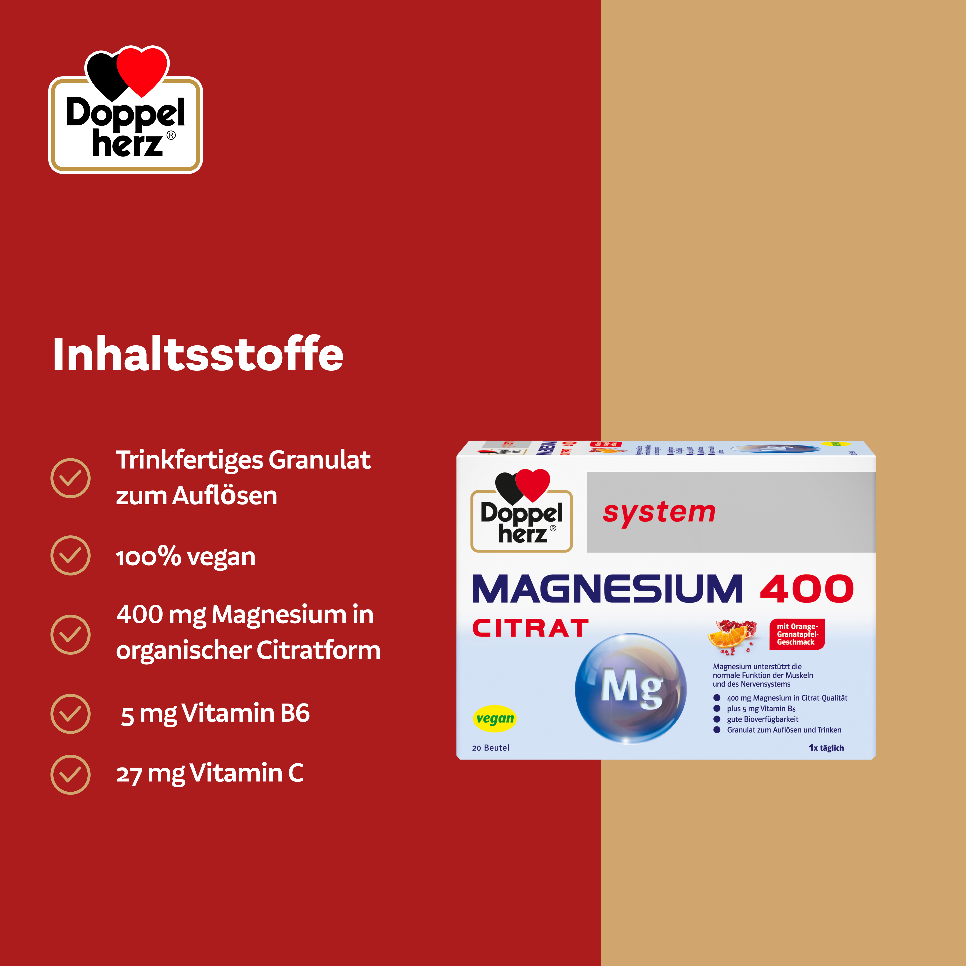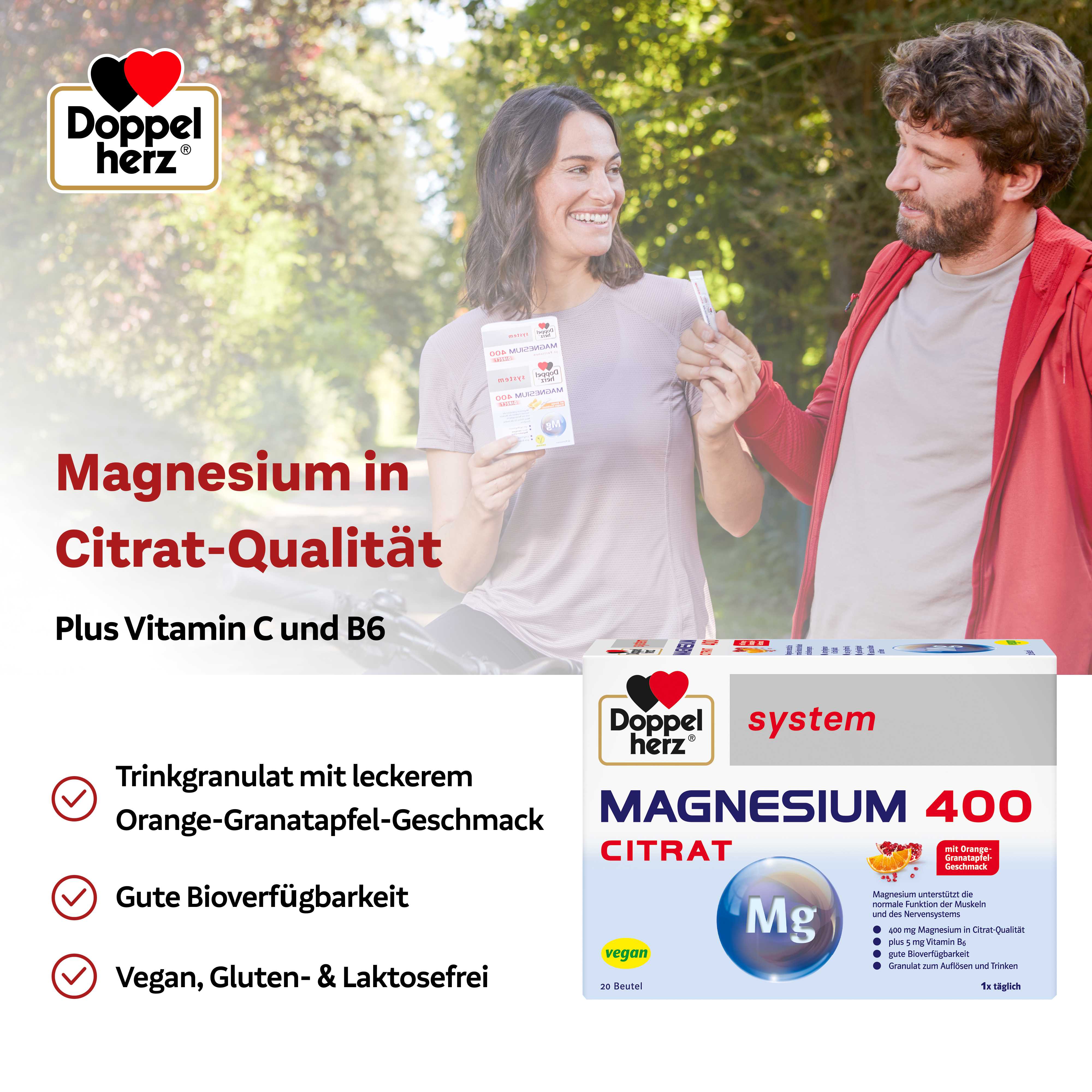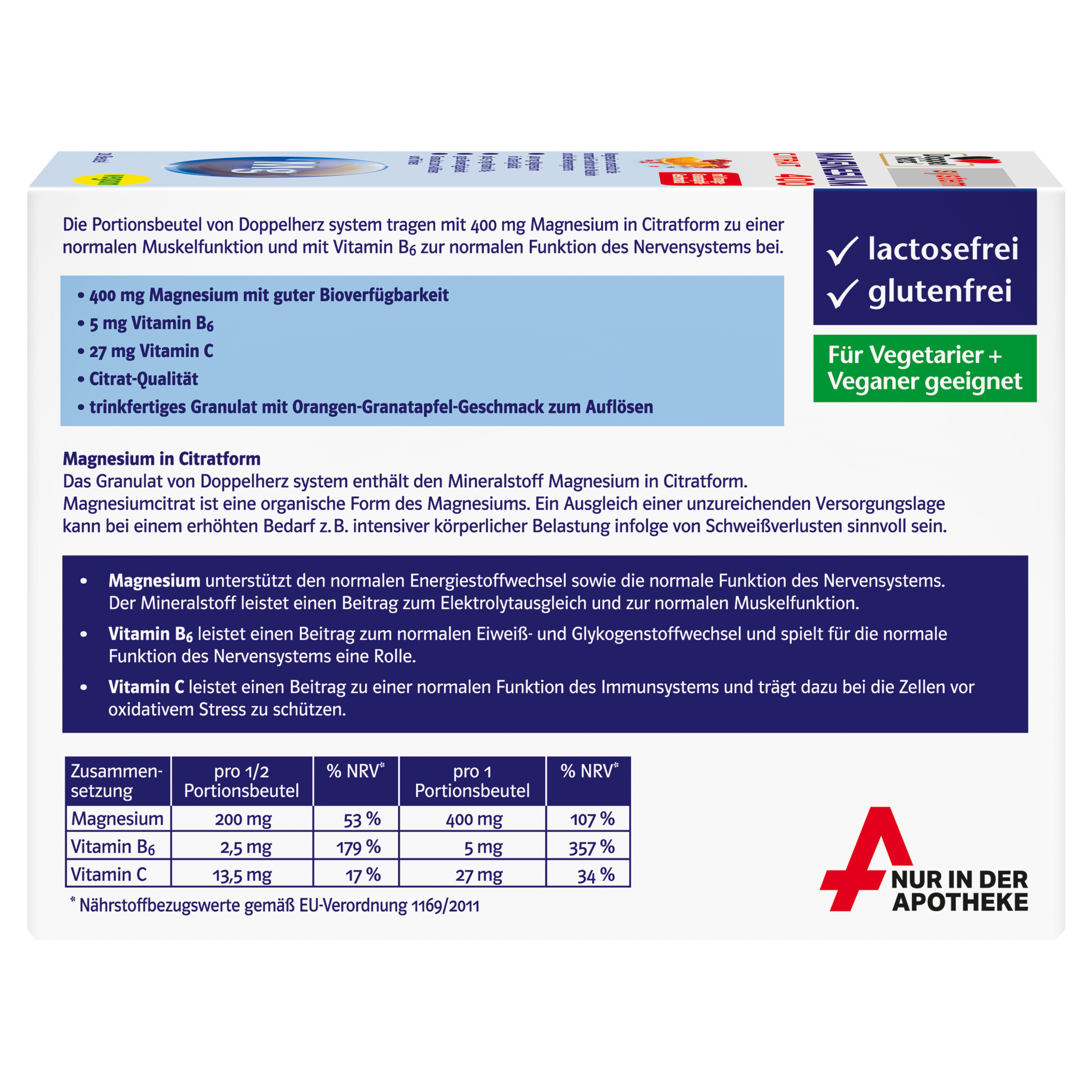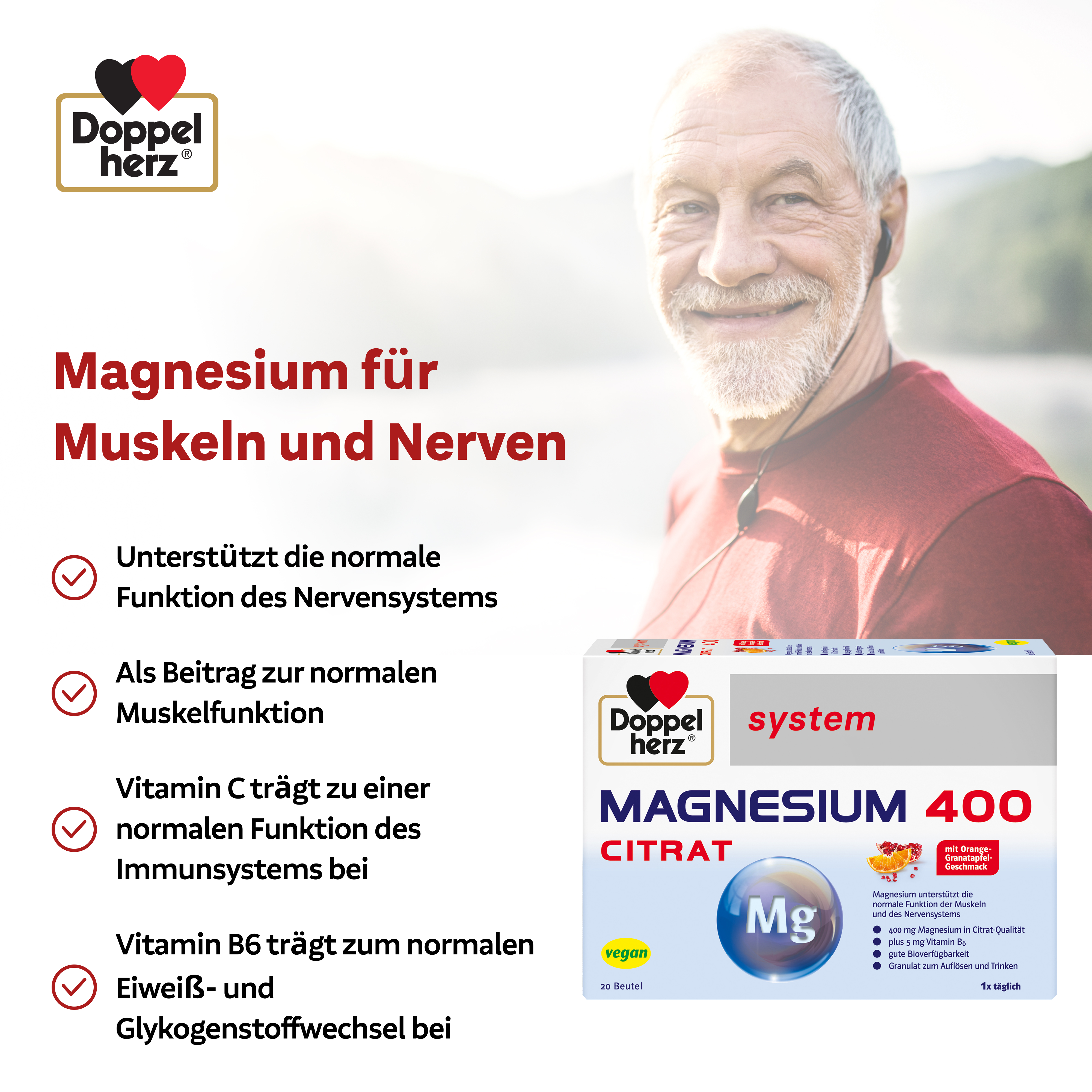 DoppelherzNahrungsergänzungsmittel sind kein Ersatz für eine ausgewogene und abwechslungsreiche Ernährung und eine gesunde Lebensweise. Die angegebene empfohlene tägliche Verzehrsmenge darf nicht überschritten werden. Außerhalb der Reichweite von kleinen Kindern aufbewahren.