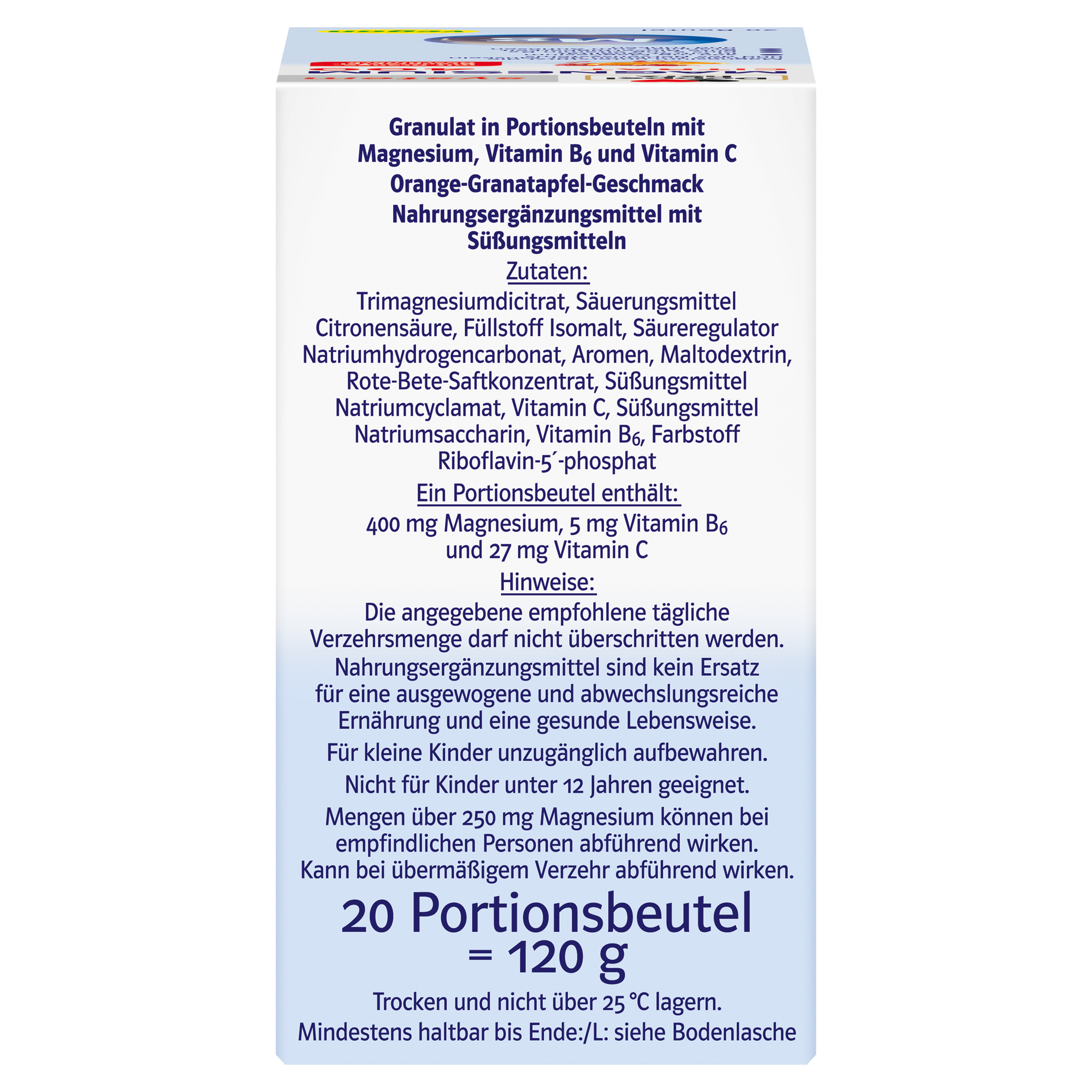 Magnesiumcitrat, Säuerungsmittel Citronensäure, Füllstoff Isomalt, Säureregulator Natriumhydrogencarbonat, Aroma, Maltodextrin, Süßungsmittel Natriumcyclamat und Natriumsaccharin, Rote-Bete-Saftpulver, L-Ascorbinsäure, Pyridoxinhydrochlorid, Farbstoff Riboflavin-5´-phosphat