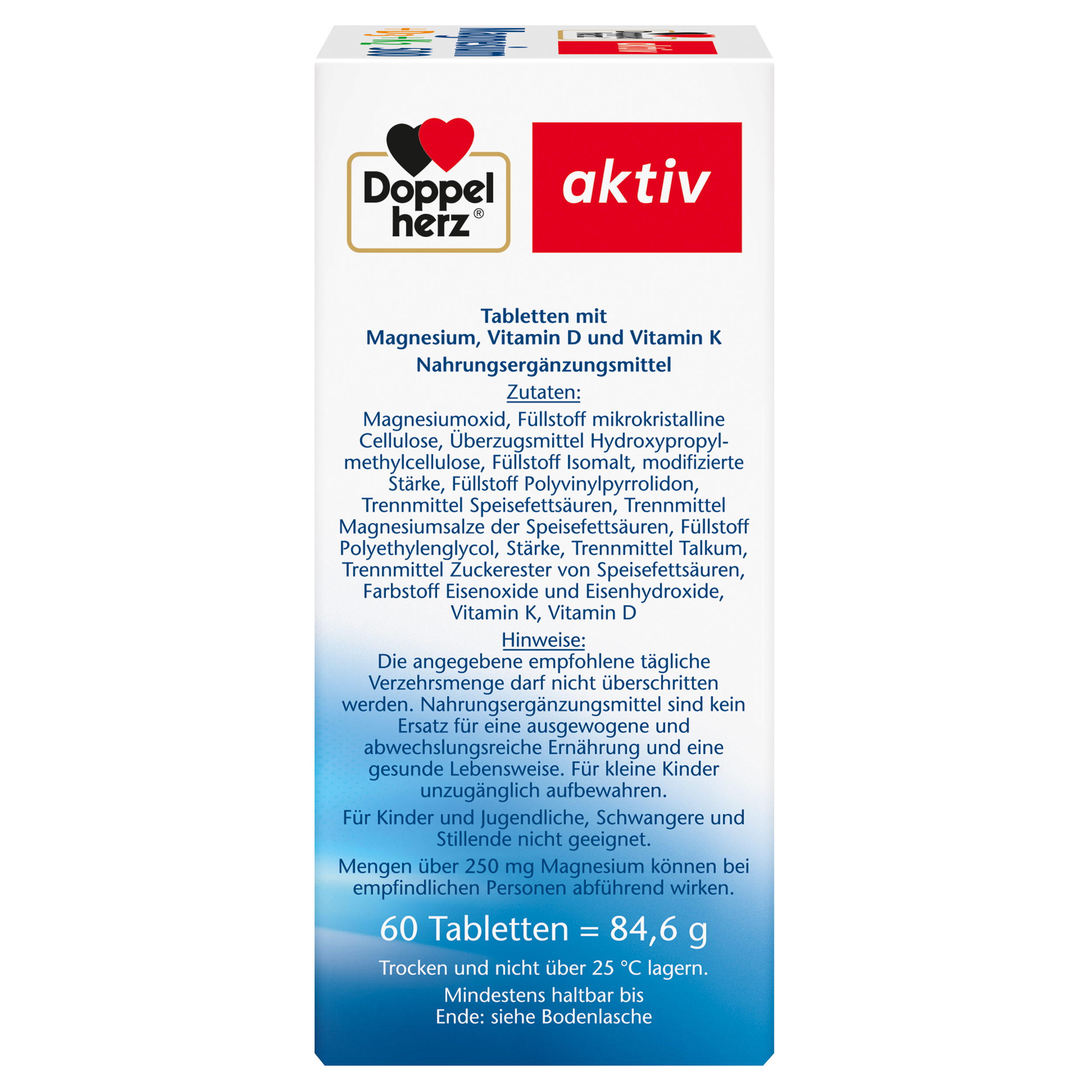 DoppelherzNahrungsergänzungsmittel sind kein Ersatz für eine ausgewogene und abwechslungsreiche Ernährung und eine gesunde Lebensweise. Die angegebene empfohlene tägliche Verzehrsmenge darf nicht überschritten werden. Außerhalb der Reichweite von kleinen Kindern aufbewahren.