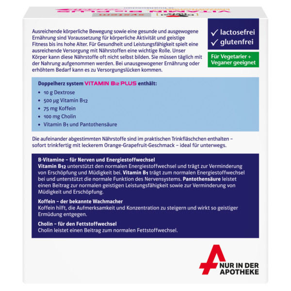 Doppelherz system VITAMIN B12 PLUS enthält 10 g Dextrose, 30 µg Vitamin B12, 75 mg Koffein, 100 mg Cholin, Vitamin B1 und Pantothensäure. Die aufeinander abgestimmten Nährstoffe sind im praktischen Trinkfläschchen enthalten – sofort trinkfertig mit leckerem Orange-GrapefruitGeschmack. Vitamin B12 unterstützt den normalen Energiestoffwechsel, trägt zur Verminderung von Erschöpfung und Müdigkeit bei und spielt für die Funktion des Nervensystems eine Rolle. Vitamin B1 trägt zum normalen Energiestoffwechsel bei und unterstützt die normale Funktion des Nervensystems. Pantothensäure leistet einen Beitrag zur normalen geistigen Leistungsfähigkeit, trägt zur Verminderung von Müdigkeit und Erschöpfung bei und spielt eine Rolle für den normalen Energiestoffwechsel. Koffein hilft, Aufmerksamkeit und Wachheit zu steigern und wirkt so geistiger Ermüdung entgegen. Es hilft, die Konzentration zu verbessern. Cholin ist eine fettähnliche Substanz, die für die Gesundheit wichtig ist und zum normalen Fettstoffwechsel beiträgt. Es ist Bestandteil von Phospholipiden, den Hauptbestandteilen der Zellmembranen und kommt daher in allen Körperzellen vor.