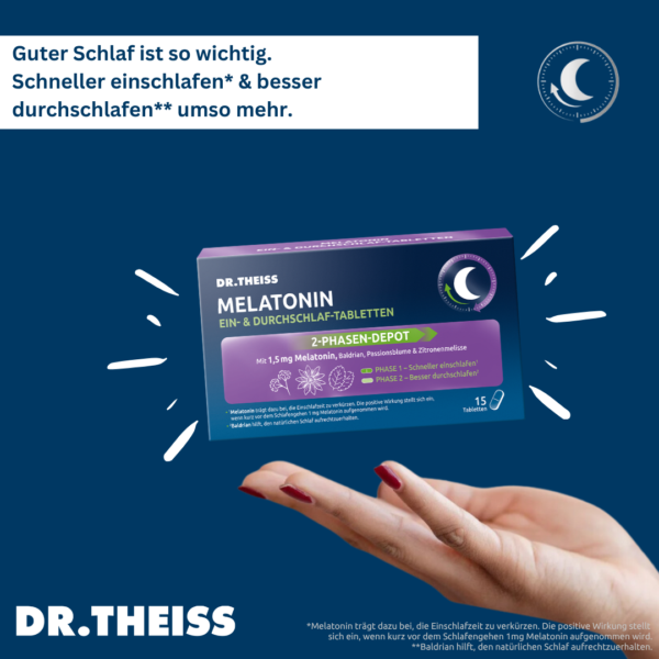 Vertrauen Sie bei Schlafproblemen auf DR. THEISS – Die meistverkauften Melatonin-Produkte in der deutschen Apotheke*. DR. THEISS Melatonin Ein- & Durchschlaf-Tabletten sind ein Nahrungsergänzungsmittel mit Melatonin und Extrakten aus Baldrianwurzel, Passionsblume und Zitronenmelisse. Melatonin ist ein natürlich vorkommendes Hormon, das von der Zirbeldrüse in unserem Gehirn produziert wird. Es spielt eine wichtige Rolle bei der Regulation unseres Schlaf-Wach-Zyklus. Melatonin wird oft als Einschlafhilfe verwendet, um Menschen dabei zu helfen, besser einzuschlafen und durchzuschlafen. Stressige Lebensphasen, Schicht- und Nachtarbeit oder lange Flugreisen über mehrere Zeitzonen hinweg, können zu Schlafproblemen führen. Für viele Menschen, die unter Schlafstörungen leiden, kann Melatonin eine effektive Lösung sein. Schlafstörungen können verschiedene Formen annehmen, wie zum Beispiel Schwierigkeiten beim Einschlafen, häufiges Aufwachen während der Nacht oder das Gefühl von nicht erholsamem Schlaf. In solchen Fällen kann die Einnahme von Melatonin z. B. in Form von Ein- & Durchschlaf-Tabletten helfen, den Schlaf-Wach-Rhythmus zu regulieren und die Schlafqualität zu verbessern. Erholsamer Schlaf ist wichtig, um die körperliche und geistige Gesundheit sowie Leistungsfähigkeit zu erhalten. Während des Schlafs erholt sich unser Körper von den Aktivitäten des Tages und bereitet sich auf den nächsten Tag vor. Stressige Lebensphasen, Schicht- und Nachtarbeit können zu Einschlafproblemen führen. DR. THEISS Melatonin Ein- & Durchschlaf-Tabletten mit einem innovativen 2-Phasen-Freisetzungsprozess: 1. Phase (schneller einschlafen): 1 mg Melatonin* trägt dazu bei die Einschlafzeit zu verkürzen. Passionsblume und Zitronenmelisse können den Schlaf unterstützen und für Entspannung sorgen. 2. Phase (besser durchschlafen**): 0,5 mg Melatonin und Baldrianwurzel-Extrakt** werden zeitversetzt abgegeben. Baldrian unterstützt das Durchschlafen. • Nahrungsergänzungsmittel bei Schlafproblemen • Schneller einschlafen, besser durchschlafen • Schlaftabletten (Nahrungsergänzungsmittel) mit 2-Phasen-Freisetzungsprozess • Unterstützung des natürlichen Schlafzyklus • Mit Melatonin, Passionsblumen- und Baldrianextrakt und Zitronenmelisse. • Laktosefrei, zuckerarm und alkoholfrei • Vegan *Melatonin trägt dazu bei, die Einschlafzeit zu verkürzen. Die positive Wirkung stellt sich ein, wenn kurz vor dem Schlafengehen 1 mg Melatonin aufgenommen wird. **Baldrian hilft, den natürlichen Schlaf aufrechtzuerhalten.s