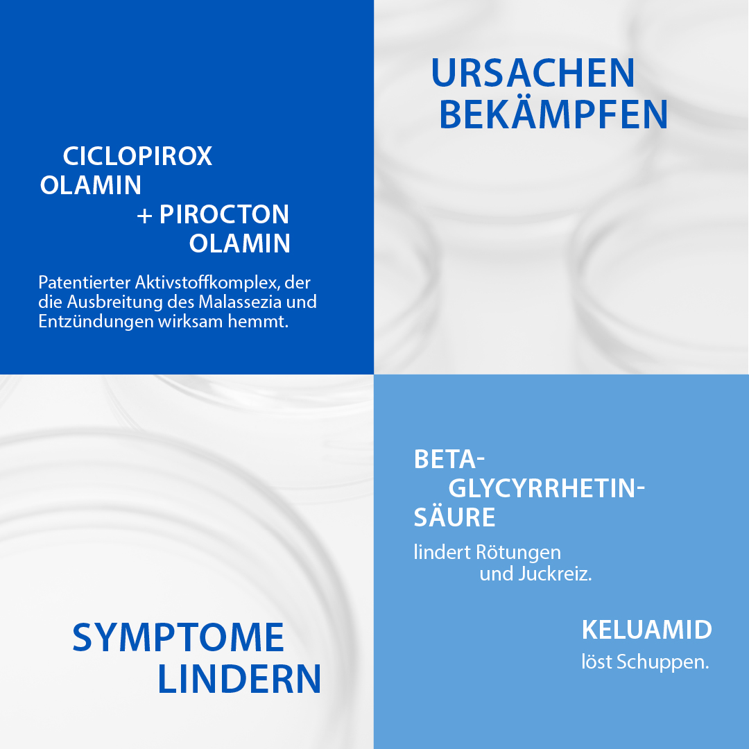Ausgelöst werden diese Schuppen vor allem durch einen Hefepilz, der zwar Bestandteil eines gesunden Kopfhautmikrobioms ist, aber bei Schuppenbefall in deutlich erhöhtem Maße auftritt. Genau gegen diesen Hefepilz gehen die beiden im KELUAL DS Intensivpflege-Shampoo enthaltenen Aktivstoffe Ciclopirox Olamin und Pirocton Olamin vor.