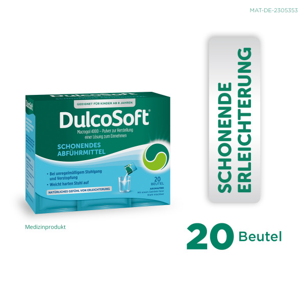 DulcoSoft® Pulver überzeugt durch seine schonende Wirkweise. Es enthält den Inhaltsstoff Macrogol 4000, der Flüssigkeit im Darm bindet und dadurch den Stuhl aufweicht. Die Darmtätigkeit wird auf diese Weise angenehm erleichtert. Das DulcoSoft® Pulver wirkt nach etwa 24 bis 72 Stunden – für einen Stuhlgang ganz ohne plötzlichen Drang. Es ist frei von Aromastoffen und deshalb sehr gut mit einem Getränk Ihrer Wahl mischbar.