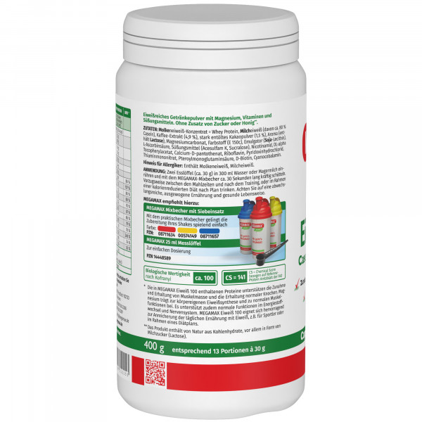 Zwei Esslöffel (ca. 30 g) in 300 ml Wasser oder Magermilch einrühren und mit dem Megamax-Mixbecher ca. 30 Sekunden lang kräftig schütteln. Vorzugsweise zwischen den Mahlzeiten und nach dem Training, oder im Rahmen einer kalorienreduzierten Diät nach Plan trinken.