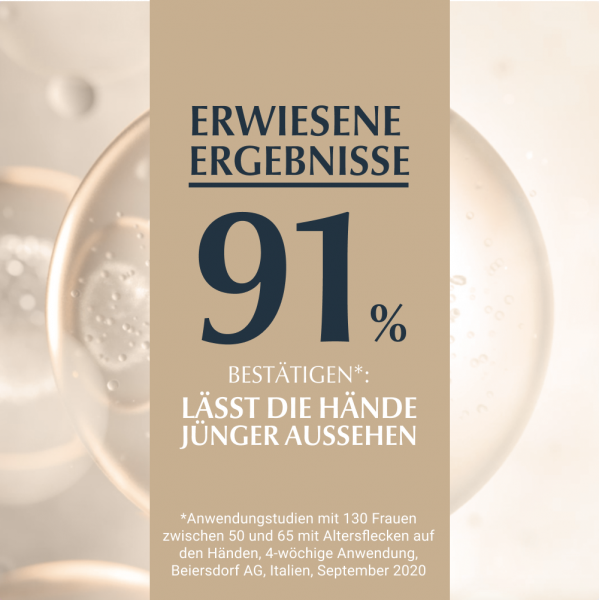 Die Eucerin Hyaluron Filler + Elasticity Handcreme ist eine feuchtigkeitsspendende Handpflege für reife Haut. Dank des patentierten Wirkstoffs Thiamidol kann sie nicht nur Altersflecken mildern, sondern beugt auch der Neuentstehung vor. Altersflecken werden nachweislich bei regelmäßiger Anwendung auf der Hand gemildert. Die Anti Age Hautcreme zieht schnell ein und versorgt die Haut bis zu 24 Stunden mit intensiver Feuchtigkeit – für ein weiches Hautgefühl. Zudem beugt die Handcreme dank LSF 30 der Entstehung neuen, sonnenbedingten Altersflecken vor. Für geschmeidige Hände verbessert die Anti Aging Creme die Elastizität und Festigkeit der Haut. Erste Ergebnisse der Anti Age Creme sowie eine Minderung der Altersflecke sind bereits nach 2 Wochen sichtbar.