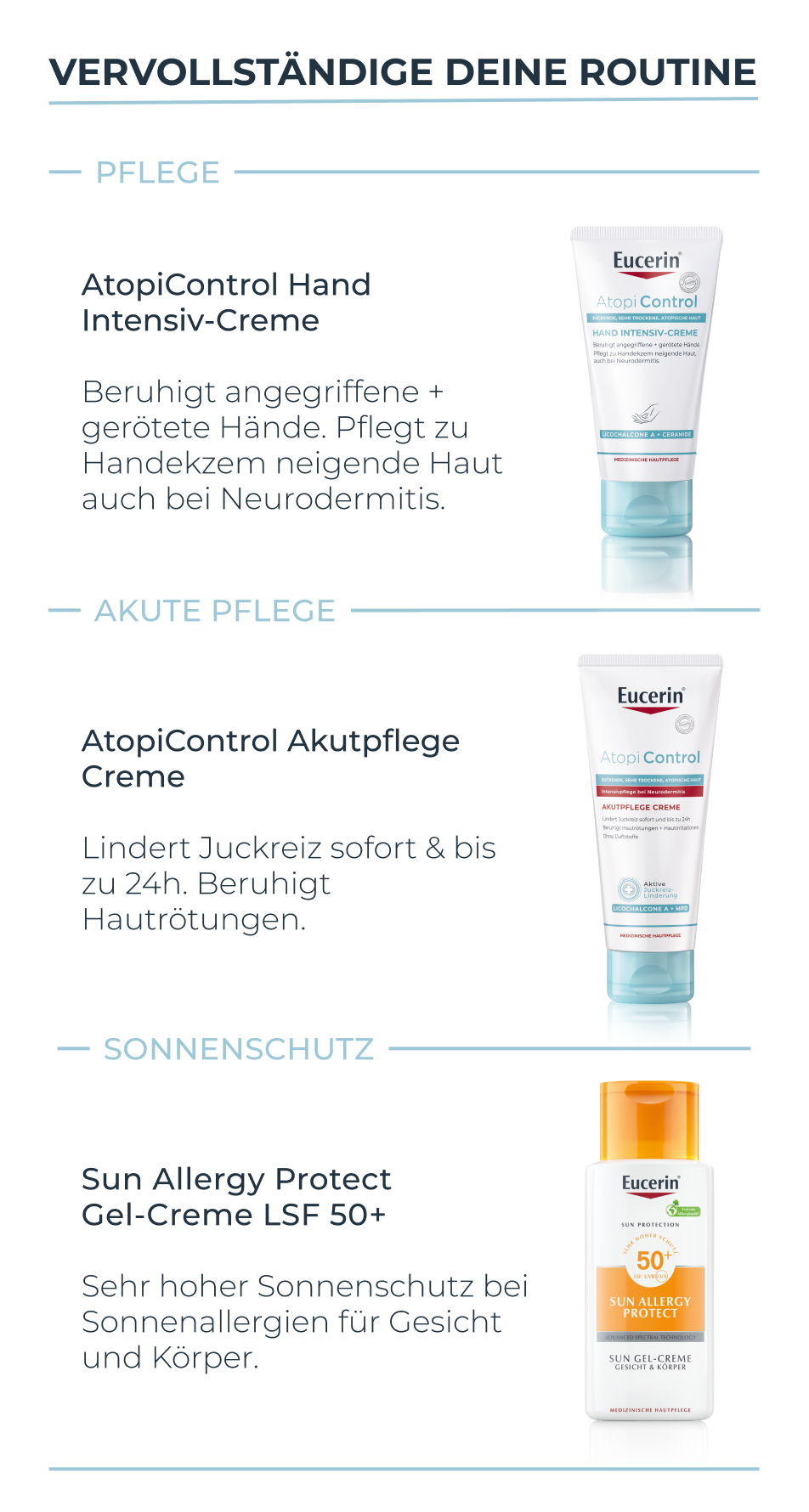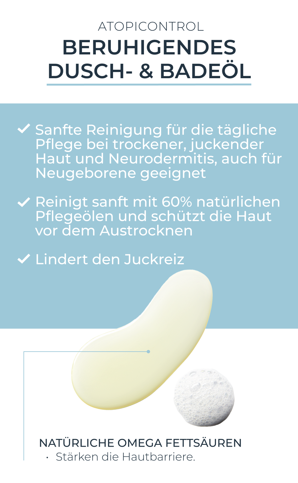 Das Eucerin AtopiControl Dusch-und Badeöl ist speziell für die sanfte Reinigung und zur Beruhigung atopischer Haut geeignet. Das Produkt eignet sich zur Körperpflege bei Neurodermitis während akuter wie auch in symptomfreien Phasen. Die Formel enthält 60% natürliche Pflegeöle und sorgt damit bei sehr trockener, gereizter und zu Neurodermitis neigender Haut schon beim Duschen und Baden für intensive Rückfettung. Das Hautgefühl wird spürbar geschmeidiger, die Haut wird vor dem Austrocknen geschützt und Juckreiz beruhigt.