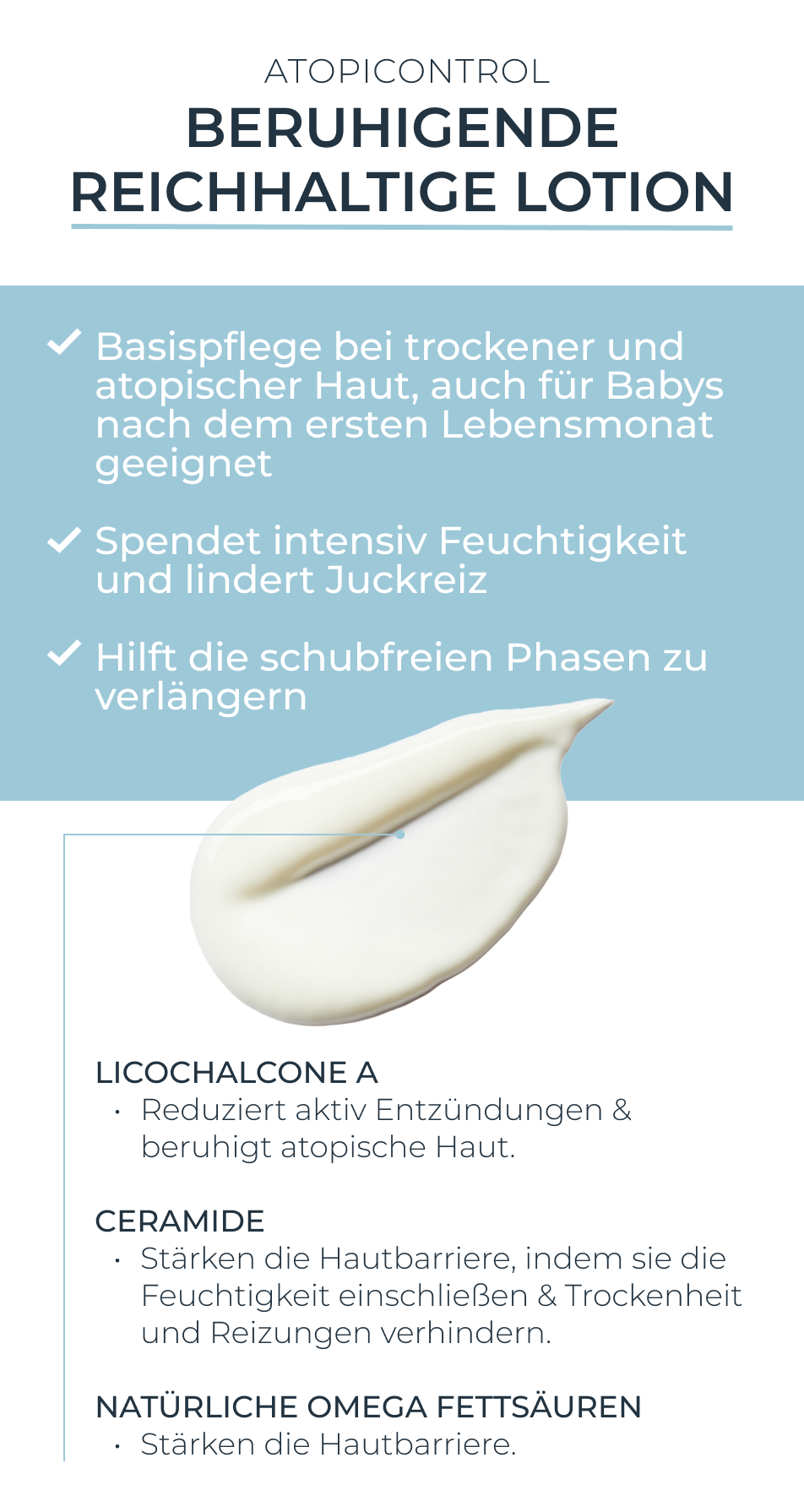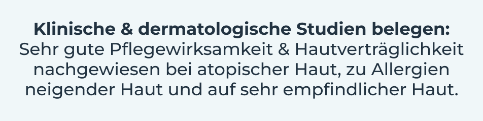 Dermatologische Studien bestätigen die Eignung der Creme für atopische Haut bei Erwachsenen, Kindern und Babys ab 3 Monaten. Durch den Verzicht auf Duftstoffe ist das Risiko von Hautirritationen und Allergien besonders gering.