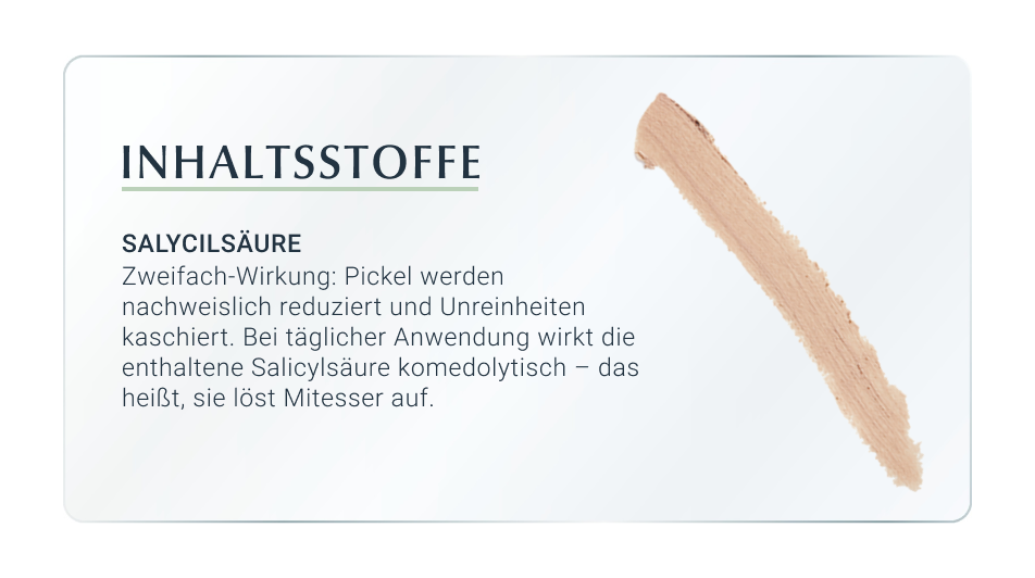 Der Eucerin DermoPure Abdeckstift wirkt auf zweifache Weise: zum einen werden Hautunreinheiten sichtbar und sofort abgedeckt, zum anderen werden nachweislich Pickel reduziert. Der Stift enthält dazu den Wirkstoff Salicylsäure und diese wirkt komedolytisch – das bedeutet, dass Mitesser bei täglicher Anwendung aufgelöst werden.