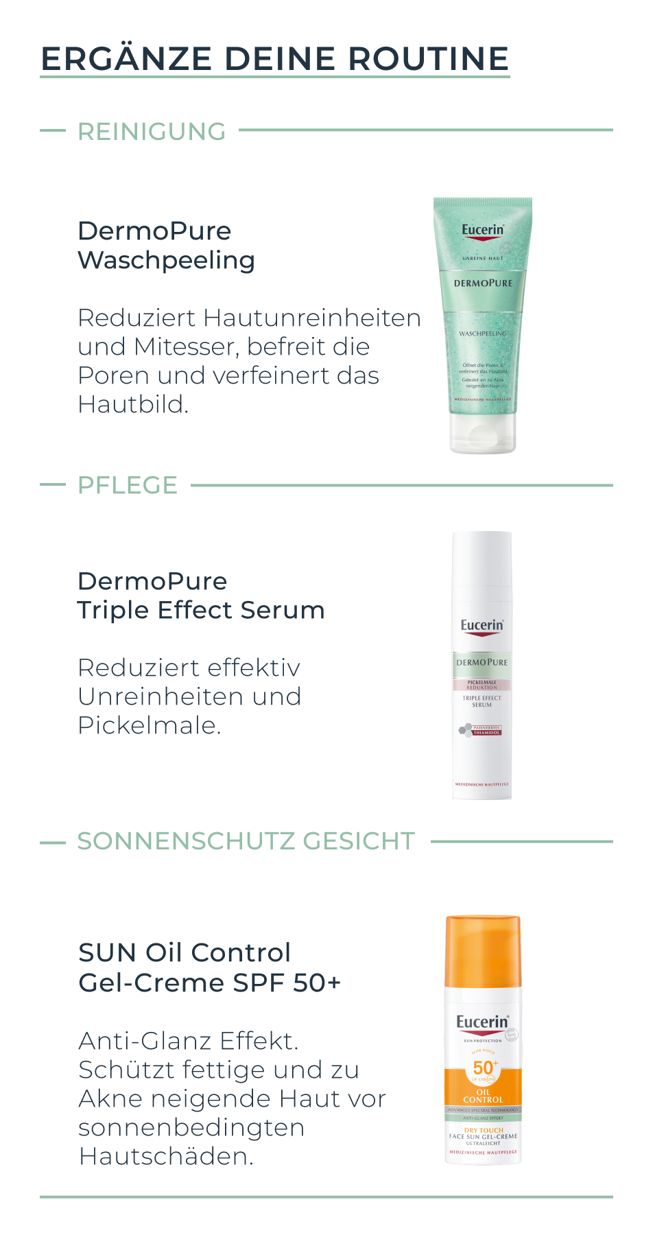 Reinigung: Die Haut mit dem DermoPure Triple Effect Reinigungsgel reinigen, um überschüssigen Talg, Schmutz und tote Hautzellen zu entfernen.