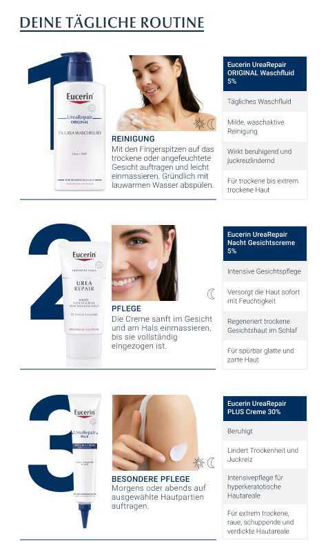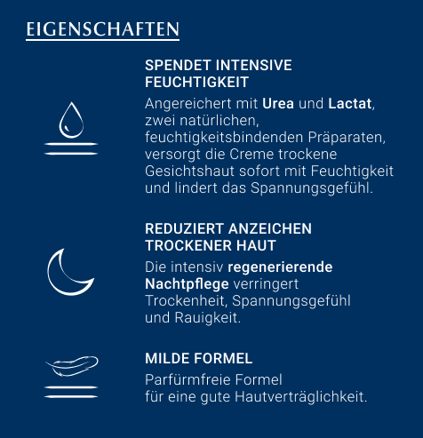Die Kombination der zwei natürlichen Wirkstoffe Urea und Lactat wirkt feuchtigkeitsbindend. Dies sorgt für eine schnelle und langanhaltende Versorgung mit Feuchtigkeit und raue Haut wird damit glatter – ein wirksamer Schutz gegen Trockenheit. Auch bei zu Schuppung neigender Haut und bei Juckreiz bietet die Creme eine wirksame Pflege.