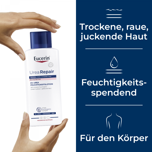 Die Eucerin UreaRepair PLUS Lotion 5% mit beruhigendem Duft ist eine hochwirksame Pflegecreme bei sehr trockener, rauer und gespannter Haut. Mit der Körperlotion wird die Haut 48 Stunden langanhaltend vor Trockenheit geschützt und die Anzeichen trockener Haut werden gelindert. Als Wasser-in-Öl Emulsion zieht die leichte Lotion schnell ein, macht die Haut glatt sowie geschmeidig und stärkt ihre Widerstandskraft.