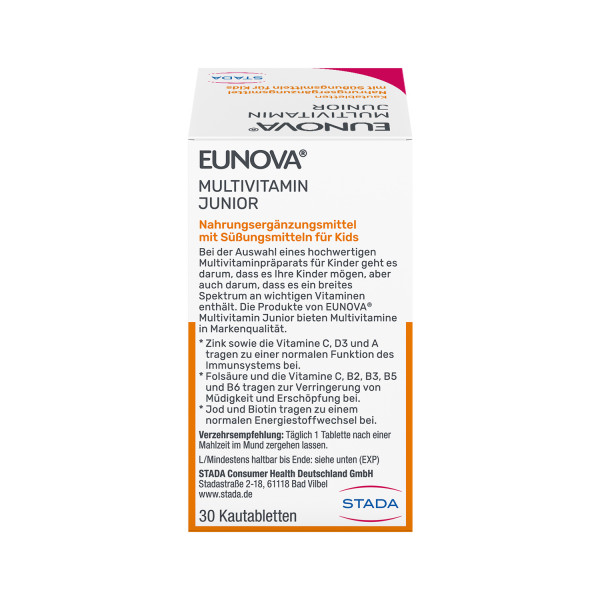 EUNOVA® Junior Kautabletten versorgen Kinder ab 4 Jahren mit 12 Vitaminen und wichtigen Mineralstoffen und haben einen besonders hohen Vitamin E Gehalt. Die lecker nach Orange schmeckenden Kautabletten sind frei von künstlichen Farb- und Konservierungsstoffen.