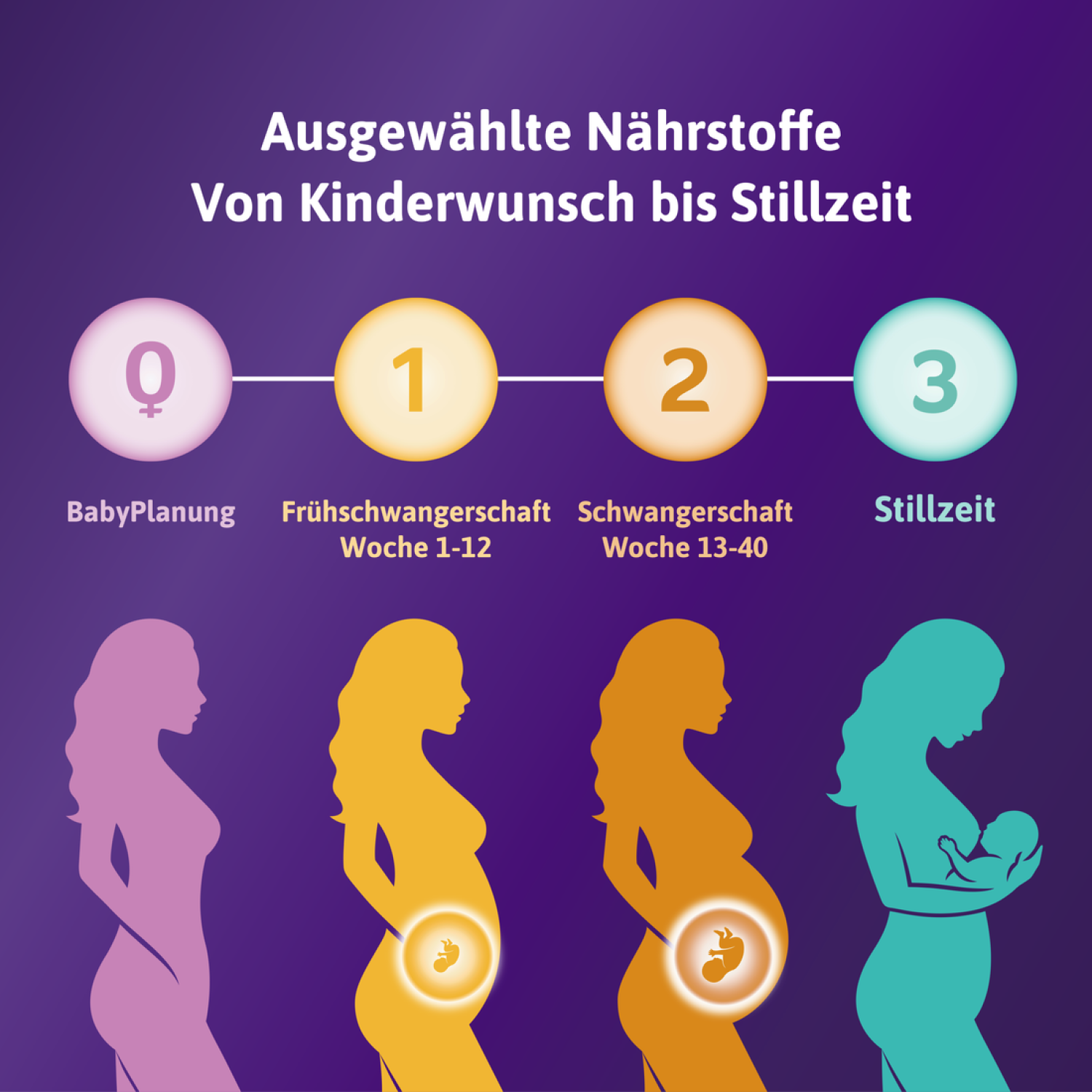 JEDERZEIT STARTEN: Mit Femibion® 0 kann an jedem Tag des Zyklus begonnen werden, auch an fruchtbaren Tagen; Empfehlung: Beginn der Nahrungsergänzung durch Folsäure mind. 1 Monat vor Schwangerschaft