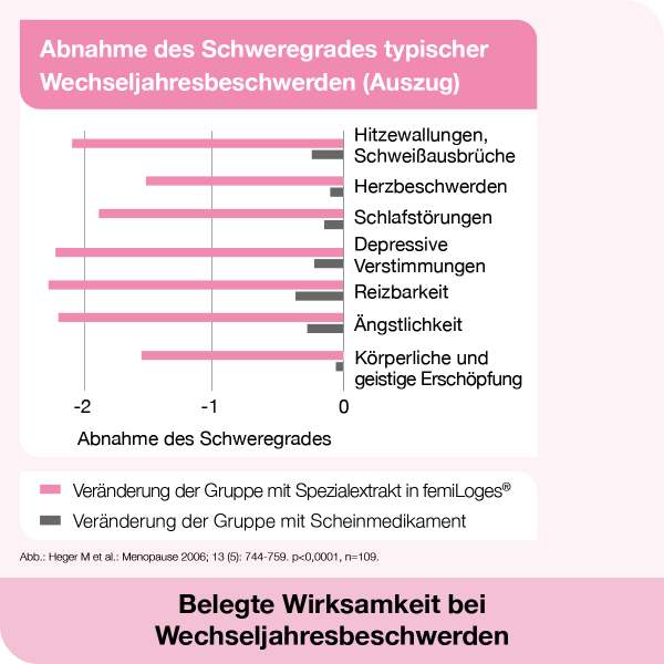 femiLoges® kann mit der Kraft der Sibirischen Rhabarberwurzel eine effektive Linderung von physischen und psychischen Wechseljahressymptomen wie Hitzewallungen, Schweißausbrüchen, Schlafstörungen und depressiven Verstimmungen bieten. Eine Studie an 109 Frauen in den Wechseljahren zeigte: Alle erfassten Wechseljahresbeschwerden konnten in der Gruppe der Frauen, die femiLoges® eingenommen hatten, im Vergleich zur Gruppe der Frauen, die ein Scheinmedikament (Placebo) verwendeten, deutlich vermindert werden.11