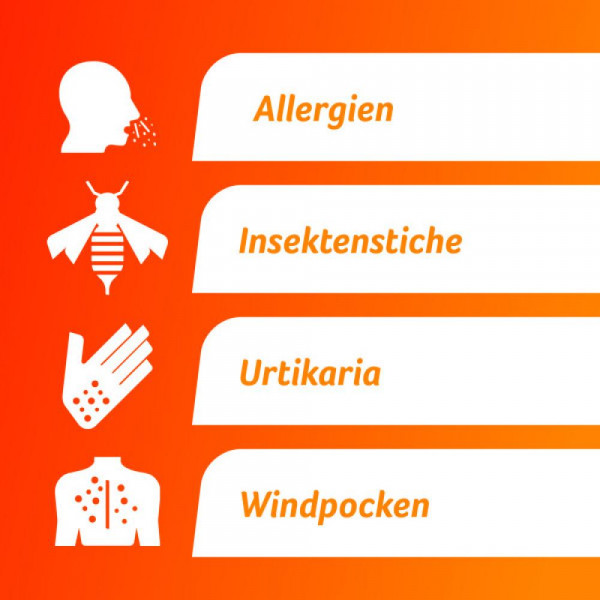 - Zur Linderung von allergischen Symptomen (z. B. Hautausschlag, Juckreiz oder allergischem Schnupfen) bei Nesselsucht und und zur Linderung von Juckreiz bei Insektenstichen geeignet