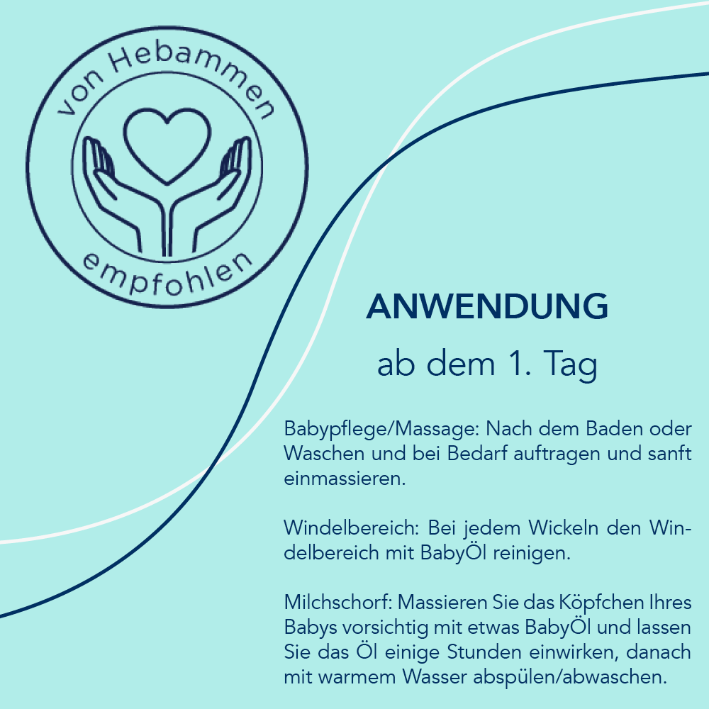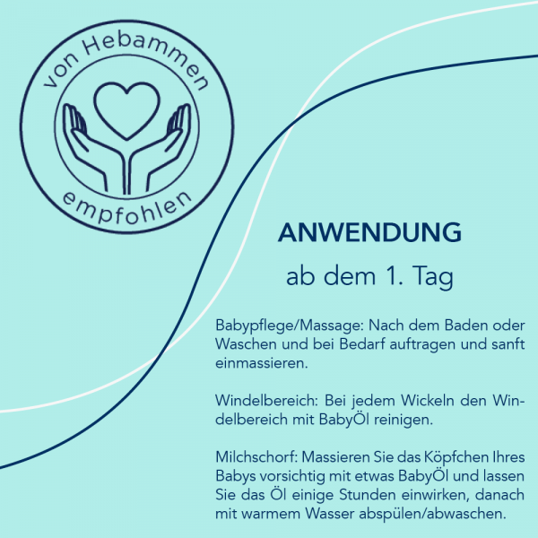 Babypflege/Massage: Nach dem Baden oder Waschen und bei Bedarf auftragen und sanft einmassieren.