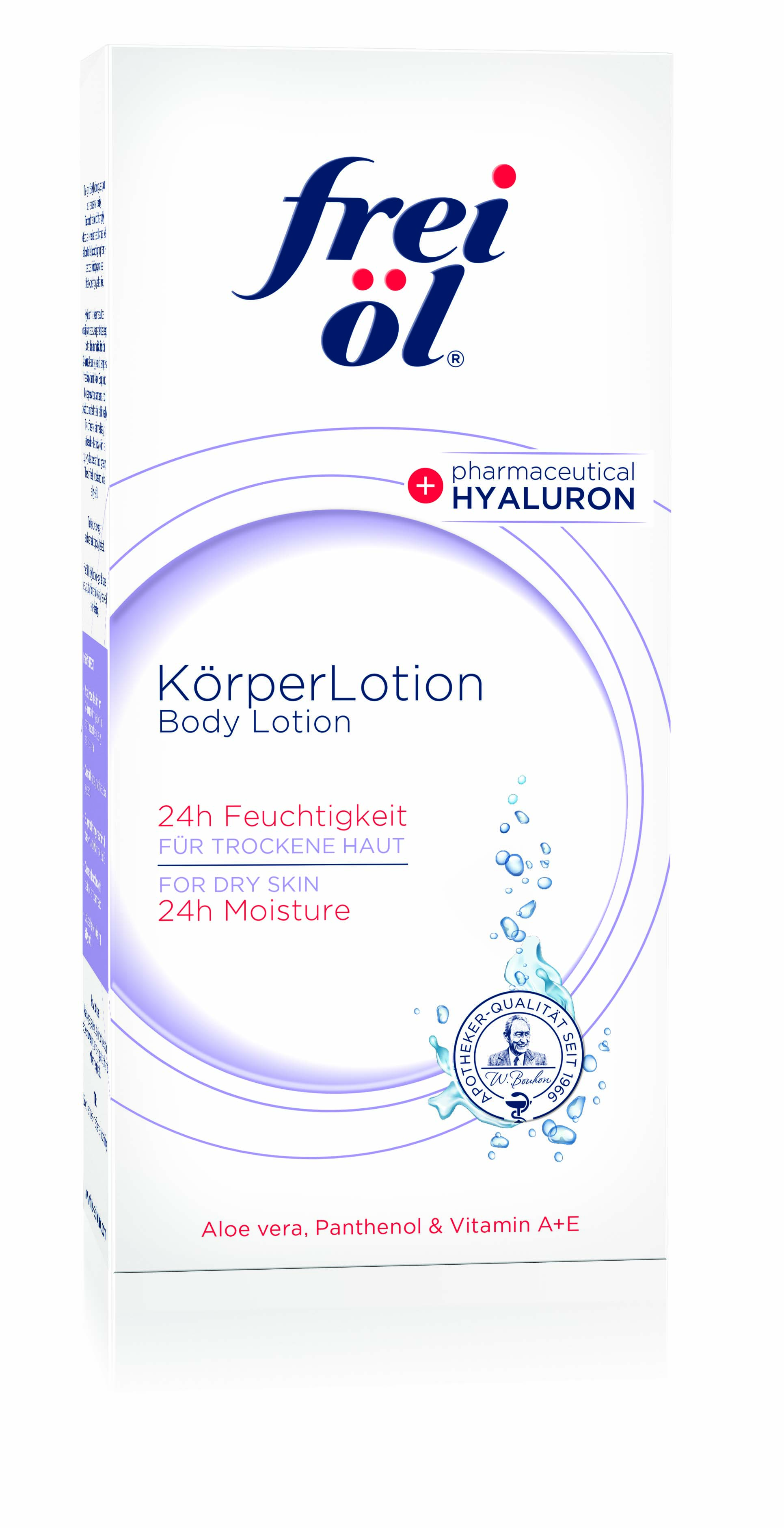 Die leichte KörperLotion hüllt Ihre Haut in pures Wohlgefühl. Das Hyaluron in reiner pharmazeutischer Qualität und Aloe vera dringen intensiv in die Haut ein und versorgen sie für 24 Stunden mit viel Feuchtigkeit. Natürliches Jojobaöl sorgt für zarte Pflege, Vitamin A und E unterstützen die Regeneration, während Panthenol und Bisabolol die Haut zusätzlich beruhigen. Der Unterschied ist sofort spürbar – die KörperLotion zieht schnell ein und fettet nicht. Die Haut fühlt sich geschmeidig an und sieht gepflegt aus. Ideal für trockene und sensible Haut. frei öl® KörperLotion – Tag für Tag sanfte Pflege für ein spürbar entspanntes Hautgefühl.