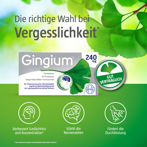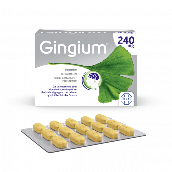 Gingium® extra 240 mg wird angewendet Zur symptomatischen Behandlung von hirnorganisch bedingten geistigen Leistungseinbußen. Die Anwendung erfolgt im Rahmen eines therapeutischen Gesamtkonzeptes bei fortschreitender Abnahme bzw. Verlust erworbener geistiger Fähigkeiten (dementielles Syndrom) mit den Hauptbeschwerden: Gedächtnisstörungen, Konzentrationsstörungen, Niedergeschlagenheit, Schwindel, Ohrensausen, Kopfschmerzen.