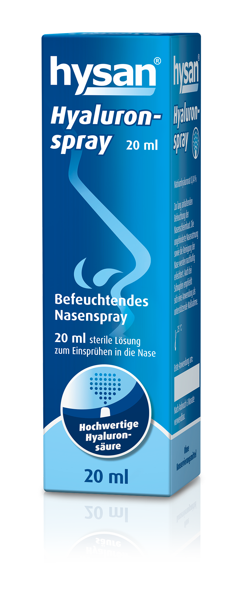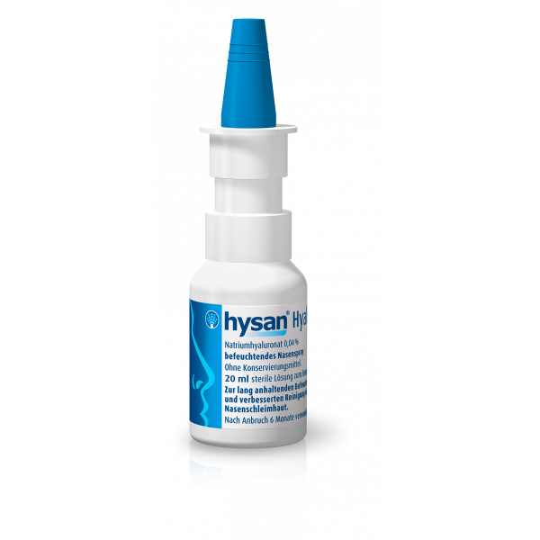 hysan® Hyaluronspray enthält verschiedene Salze und Hyaluronsäure. Hyaluronsäure ist ein natürlicher Bestandteil der Schleimhaut und trägt aufgrund der wasserbindenden Eigenschaften zur Befeuchtung der gesunden Nase bei. hysan® Hyaluronspray befeuchtet die strapazierte Schleimhaut, erleichtert die Nasenatmung und die Selbstreinigung auf natürliche Art.