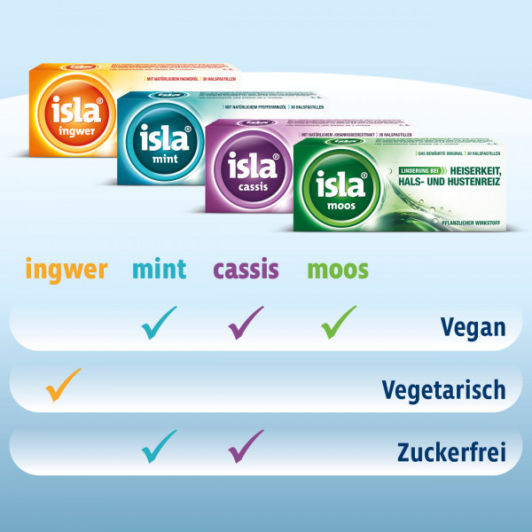 Die Inhaltsstoffe von isla® cassis legen sich wie Balsam über die Schleimhaut in Hals und Rachen. So wird die gereizte Schleimhaut vor weiteren Angriffen geschützt und kann sich durch die wohltuende Wirkung schneller erholen, insbesondere bei Beschwerden im Hals durch•Hustenreiz und Heiserkeit•starke Beanspruchung der Stimmbänder (Sänger,Redner)•trockene Atemluft (geheizt oder klimatisiert)•Mundtrockenheit•eingeschränkte Nasenatmung.
