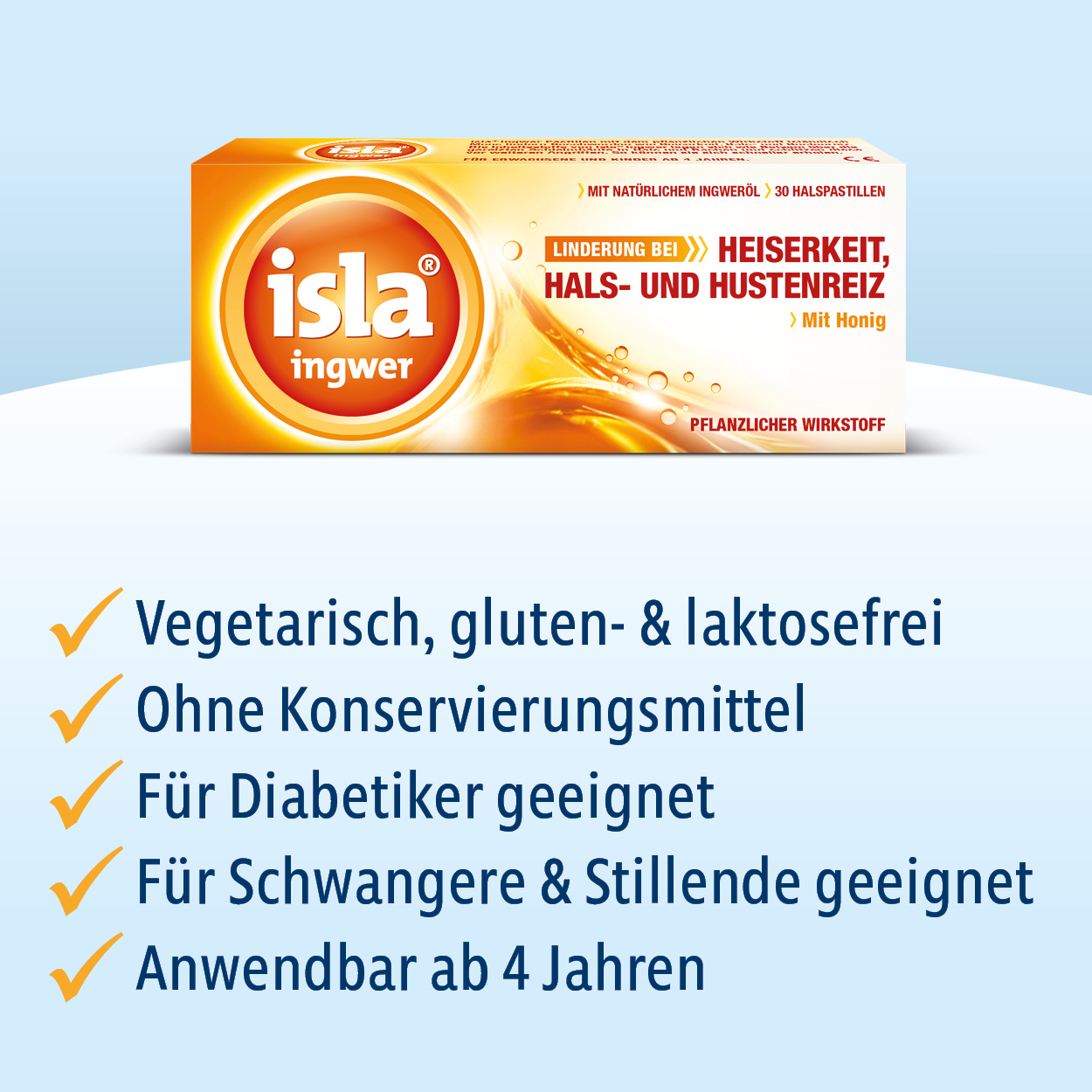 Bitte nehmen Sie isla ingwer erst nach Rücksprache mit Ihrem Arzt ein, wenn Ihnen bekannt ist, dass Sie unter einer Unverträglichkeit gegenüber bestimmten Zuckern leiden.
