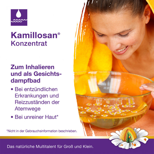 Anwendung: Zur Inhalation bei entzündlichen Erkrankungen und Reizzuständen der Atemwege. Als Zusatz für feuchte Umschläge, Spülungen oder Waschungen bei entzündlichen Haut- und Schleimhauterkrankungen einschließlich der Mundhöhle und des Zahnfleisches. Als Zusatz zu Teil- und Sitzbädern oder Spülungen bei Entzündungen im Analbereich und im Bereich der Geschlechtsorgane. Zum Einnehmen bei krampfartigen und entzündlichen Erkrankungen im Magen-Darm-Bereich. Bei Beschwerden, die länger als eine Woche dauern oder periodisch wiederkehren, bei großflächingen Entzündungen oder eitrig belegten Hautveränderungen sollte ein Arzt aufgesucht werden.