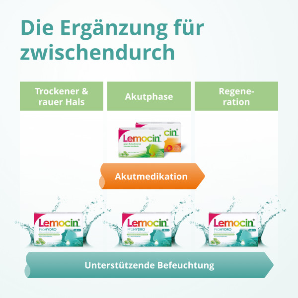 Mehr Feuchtigkeit für zwischendurch: Das Nahrungsergänzungsmittel Lemocin® ProHYDRO kann eine passende Ergänzung zwischen der Anwendung von Lemocin® sein. Die Lutschtabletten können zur Unterstützung der Regeneration der Schleimhäute im Alltag zum Einsatz kommen.