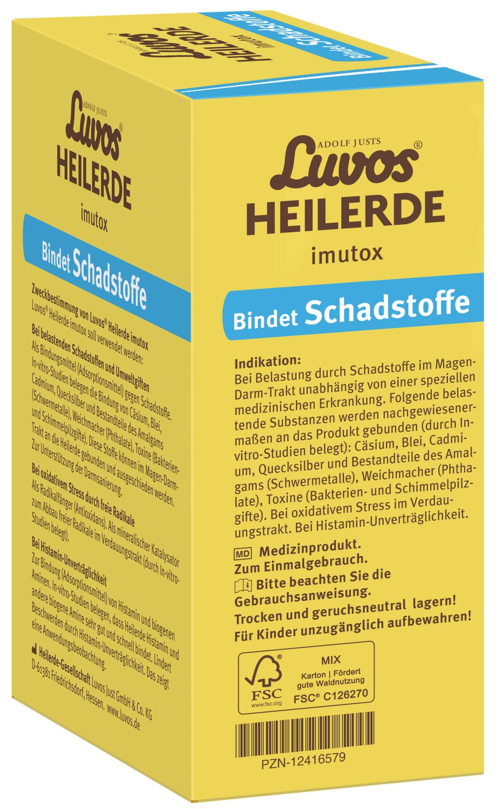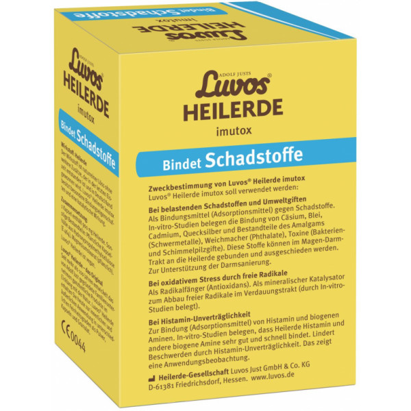 Adolf Justs Luvos® Heilerde imutox Pulver ist ein Medizinprodukt, das zur Unterstützung des Organismus bei der Körperentgiftung, Darmsanierung, Entschlackung sowie Entlastung der Leber und Niere durch Bindung von Schadstoffen und Umweltgiften aus der Nahrung verwendet wird. Beispielsweise werden gebunden: belastende Substanzen (radioaktives Cäsium), Schwermetalle (Blei, Cadmium, Quecksilber und Bestandteile des Amalgams), Weichmacher (Phthalate), Toxine (Bakterien- und Schimmelpilzgifte).